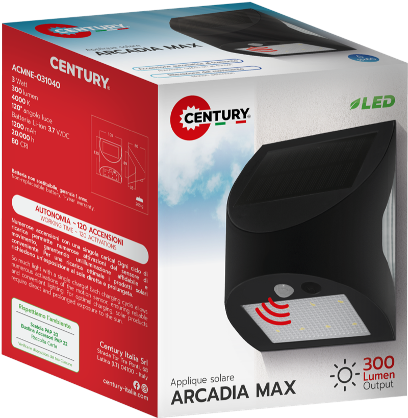 Objevte spojení moderního designu, úsporného provozu a maximálního pohodlí s nástěnným solárním svítidlem CENTURY ARCADIA MAX. Toto elegantní osvětlení přináší nejen styl, ale také absolutní svobodu – díky integrovanému fotovoltaickému panelu nepotřebujete žádné kabely ani složitou instalaci.