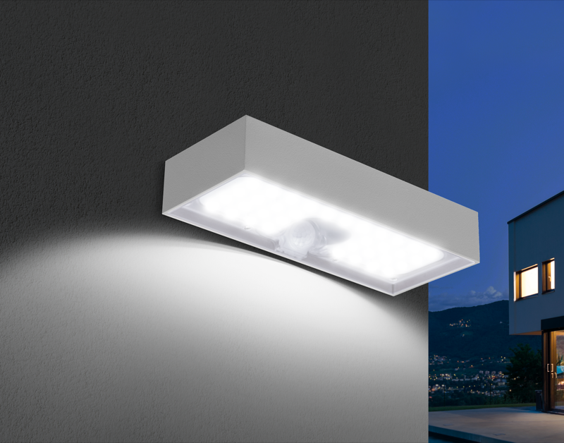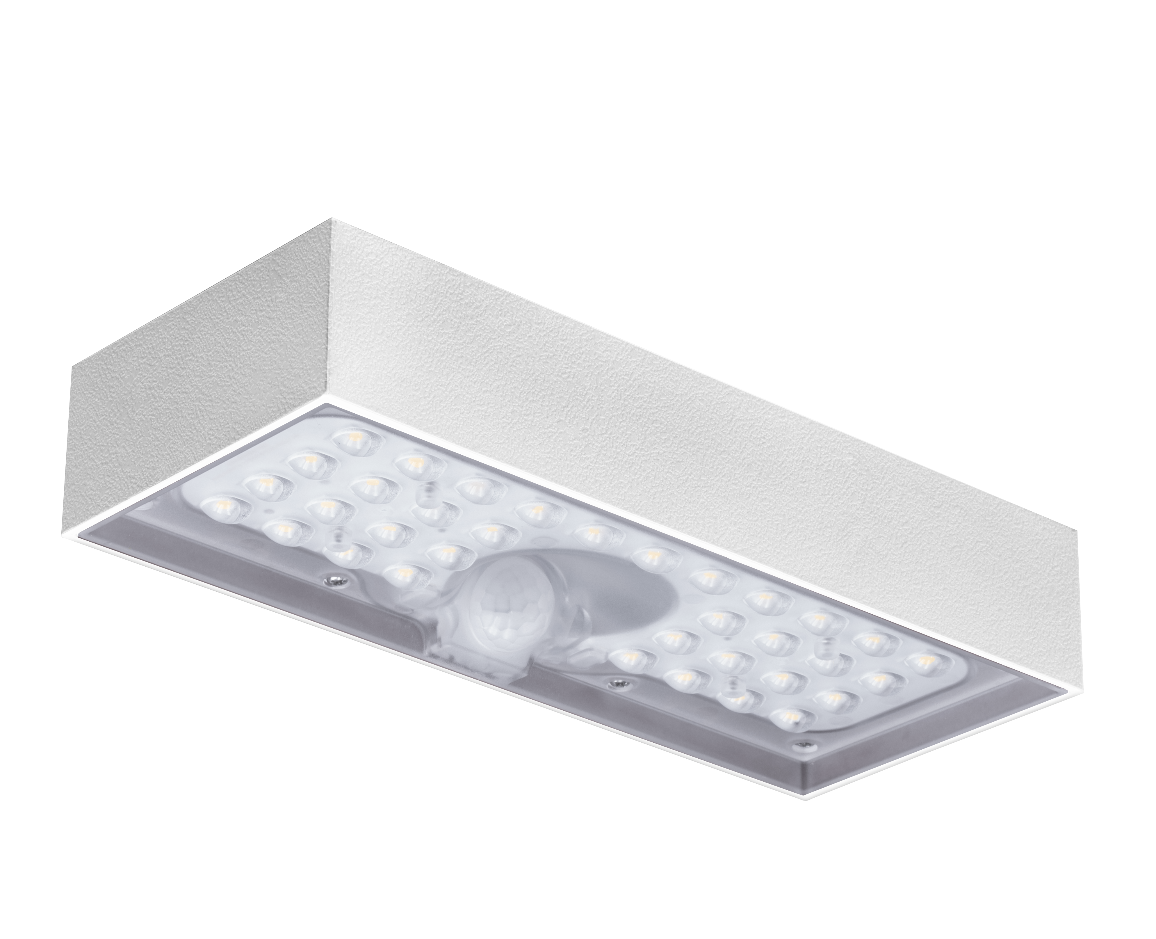 Solární svítidlo k přisazení nástěnné osazené senzorem denního světla a PIR pohybovým čidlem.
