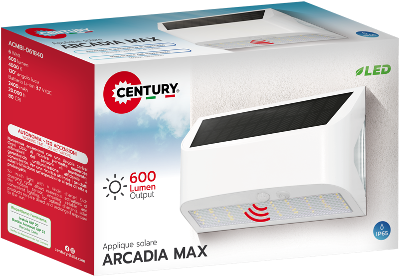 Objevte spojení moderního designu, úsporného provozu a maximálního pohodlí s nástěnným solárním svítidlem CENTURY ARCADIA MAX. Toto elegantní osvětlení přináší nejen styl, ale také absolutní svobodu – díky integrovanému fotovoltaickému panelu nepotřebujete žádné kabely ani složitou instalaci.