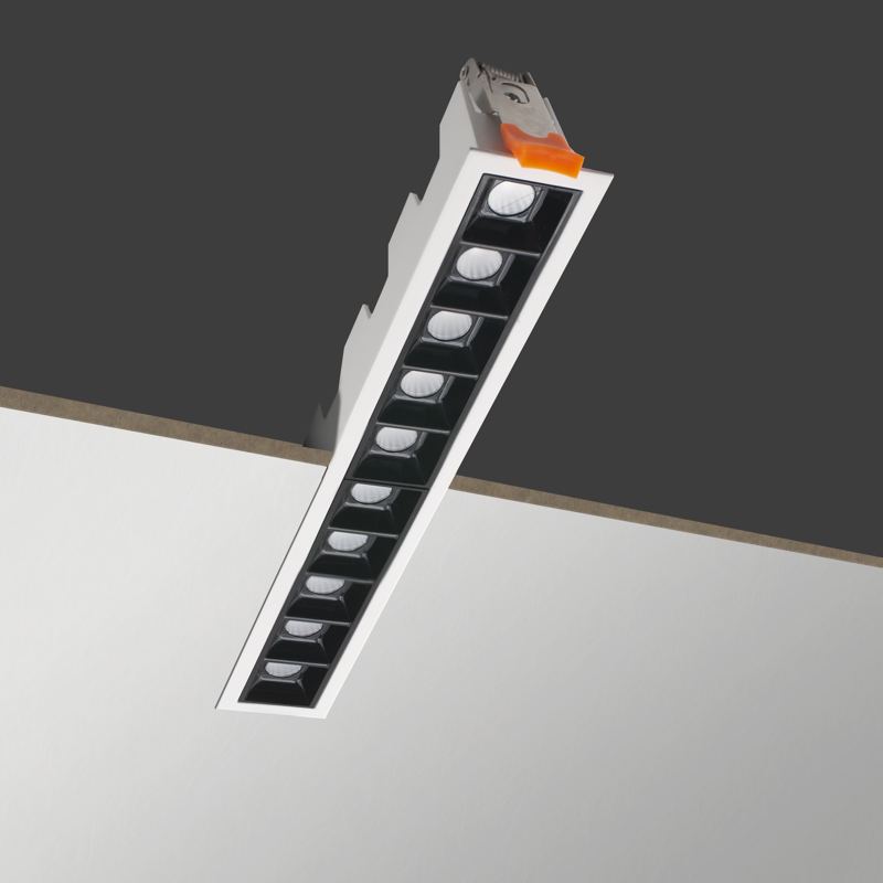 Svítidlo pro zapuštěnou instalaci. 28 mm čočky pro efekt lehkého řezání. Vysoké UGR proti oslnění, velmi utopené čipy s optikou, skrytý výstup světla.