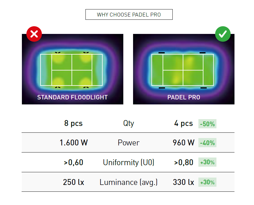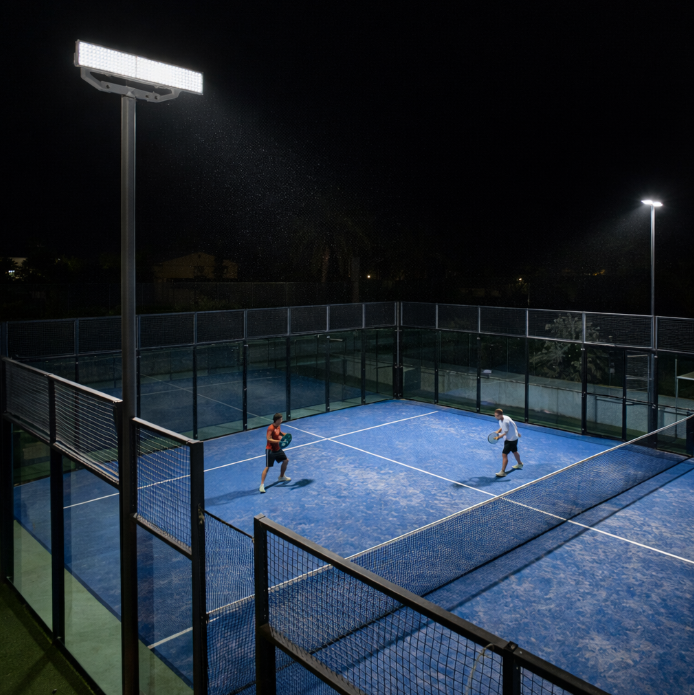 - Profesionální asymetrická optika 60x110° – ideální rozložení světla pro padelové kurty