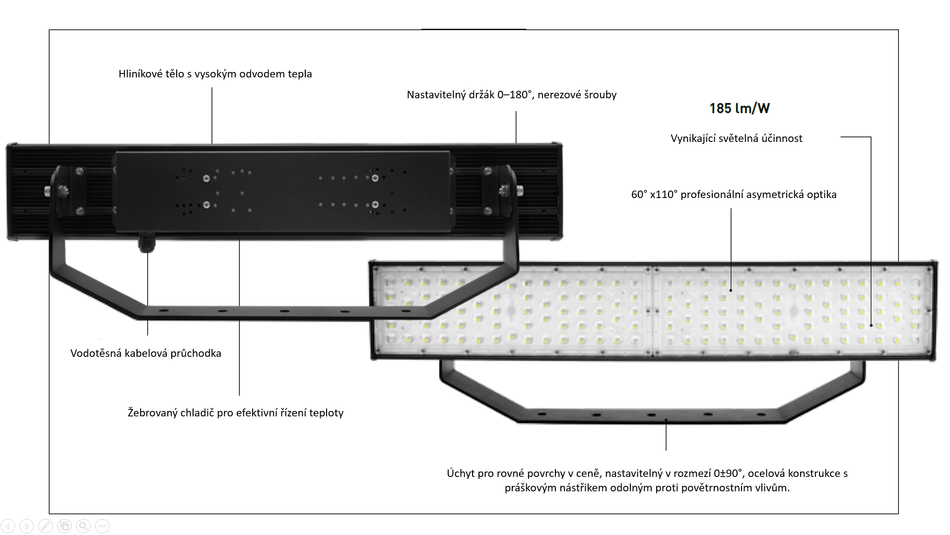 - Vysoká světelná účinnost 185 lm/W – maximální výkon při efektivní spotřebě