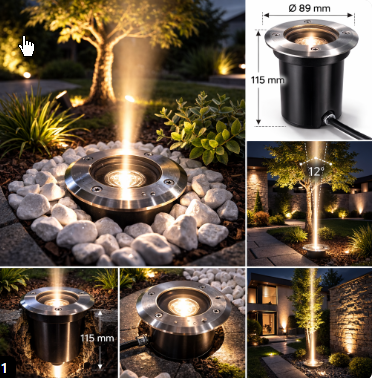 Tělo o průměru 89 mm a výšce 115 mm umožňuje pevnou a stabilní instalaci do země. Krytí IP65 chrání svítidlo proti prachu a stříkající vodě, což jej předurčuje pro venkovní použití. Napájení 24V zajišťuje bezpečný provoz v nízkonapěťových systémech.