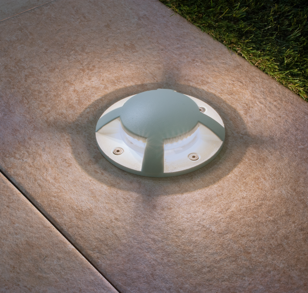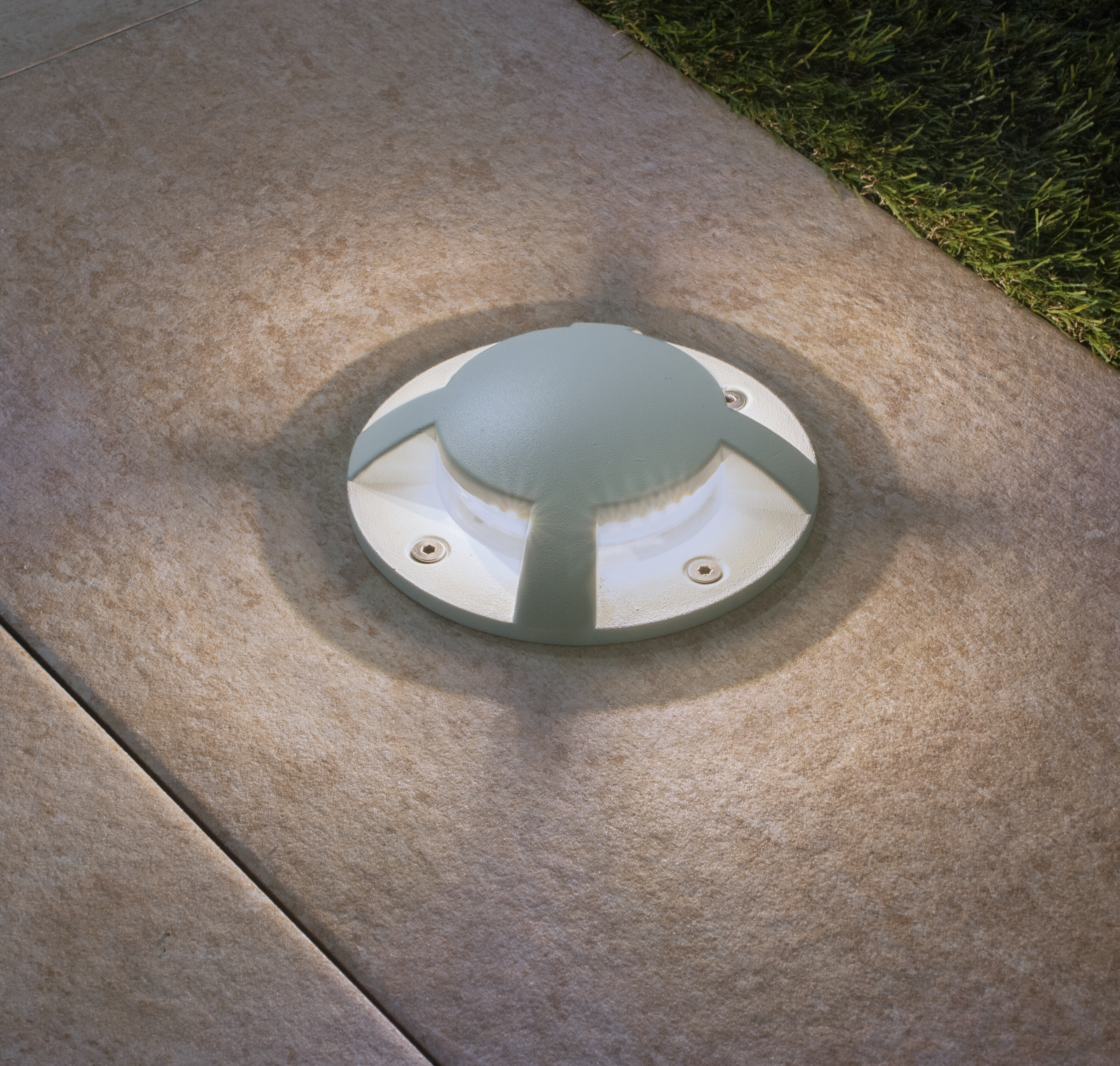 Pochůzný povrch nebo zapuštěné světlo pro instalaci na podlahu. Hliníkové tělo, neoprenový kabel. Odolnost vůči tlaku 500 Kg.