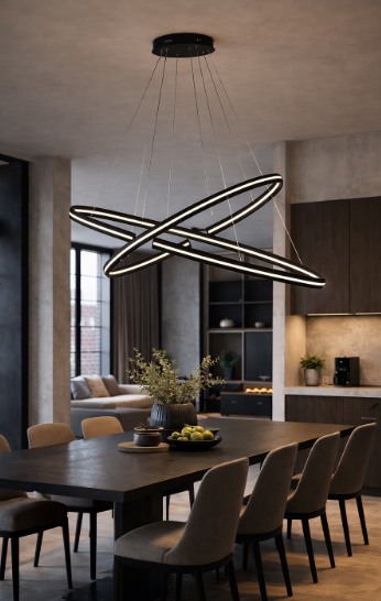 Závěsné svítidlo CLARKE od značky FAN Europe je působivým příkladem moderního designu, který pracuje s prostorem, linií a světlem. Dvě vzájemně se protínající světelné smyčky o rozměrech 120 × 60 cm a 80 × 40 cm vytvářejí dynamickou kompozici, která okamžitě upoutá pozornost a stane se ústředním prvkem interiéru.