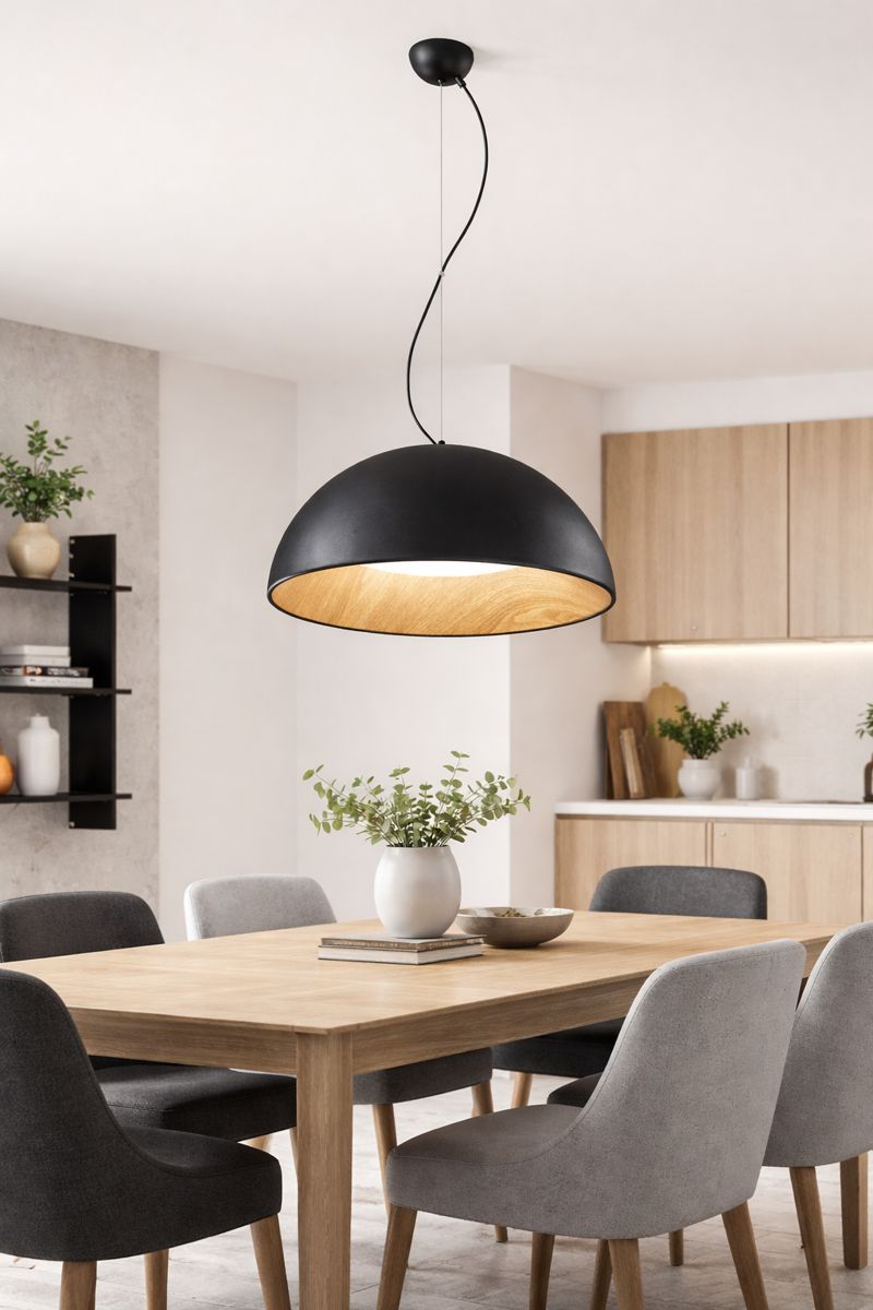 Minimalismus s teplým detailem: závěsné LED svítidlo FAN Europe COCO zaujme kontrastem matné černé a přírodního dekoru dřeva. Polokulový tvar působí moderně a nadčasově, zatímco dřevěný vnitřek dodává prostoru útulnost. Svítidlo je navrženo jako dominantní prvek interiéru, který spojuje design a funkčnost v dokonalé rovnováze.