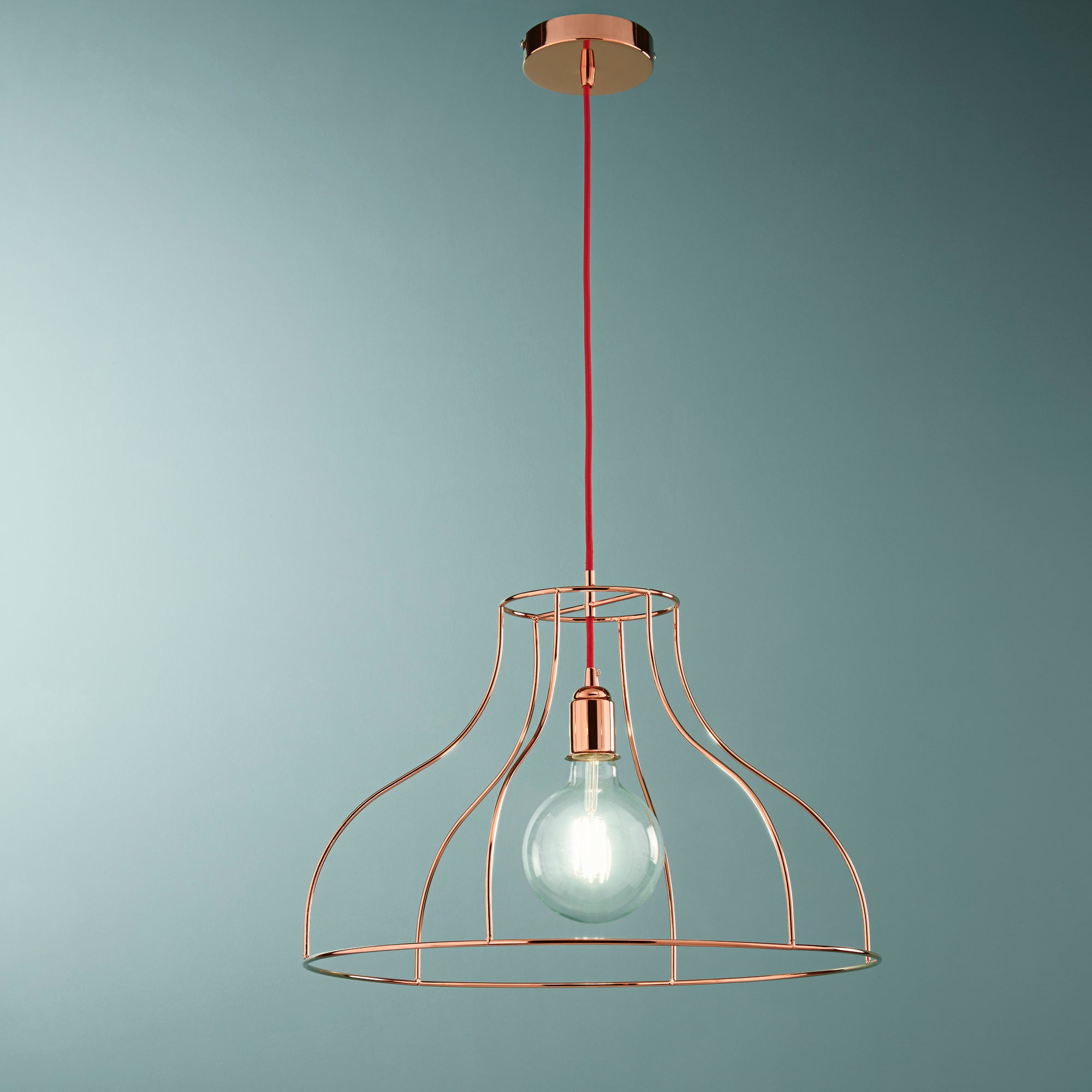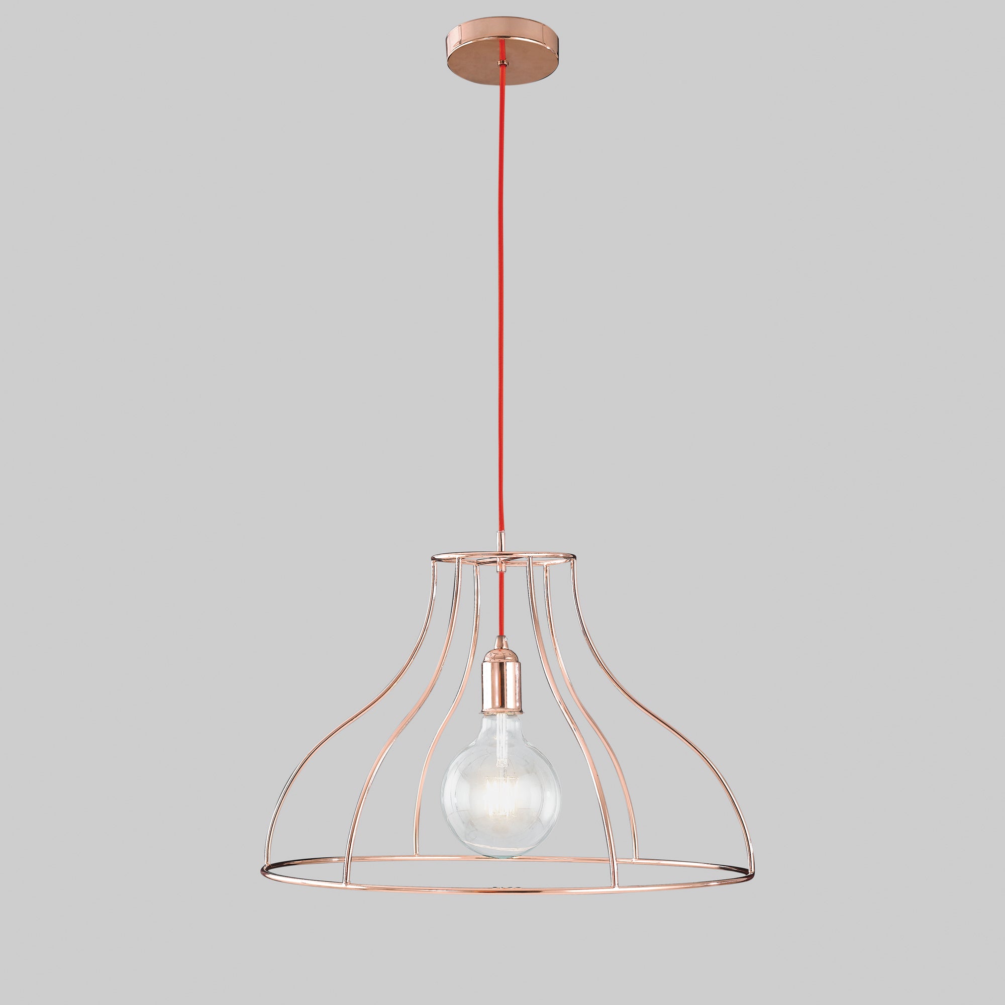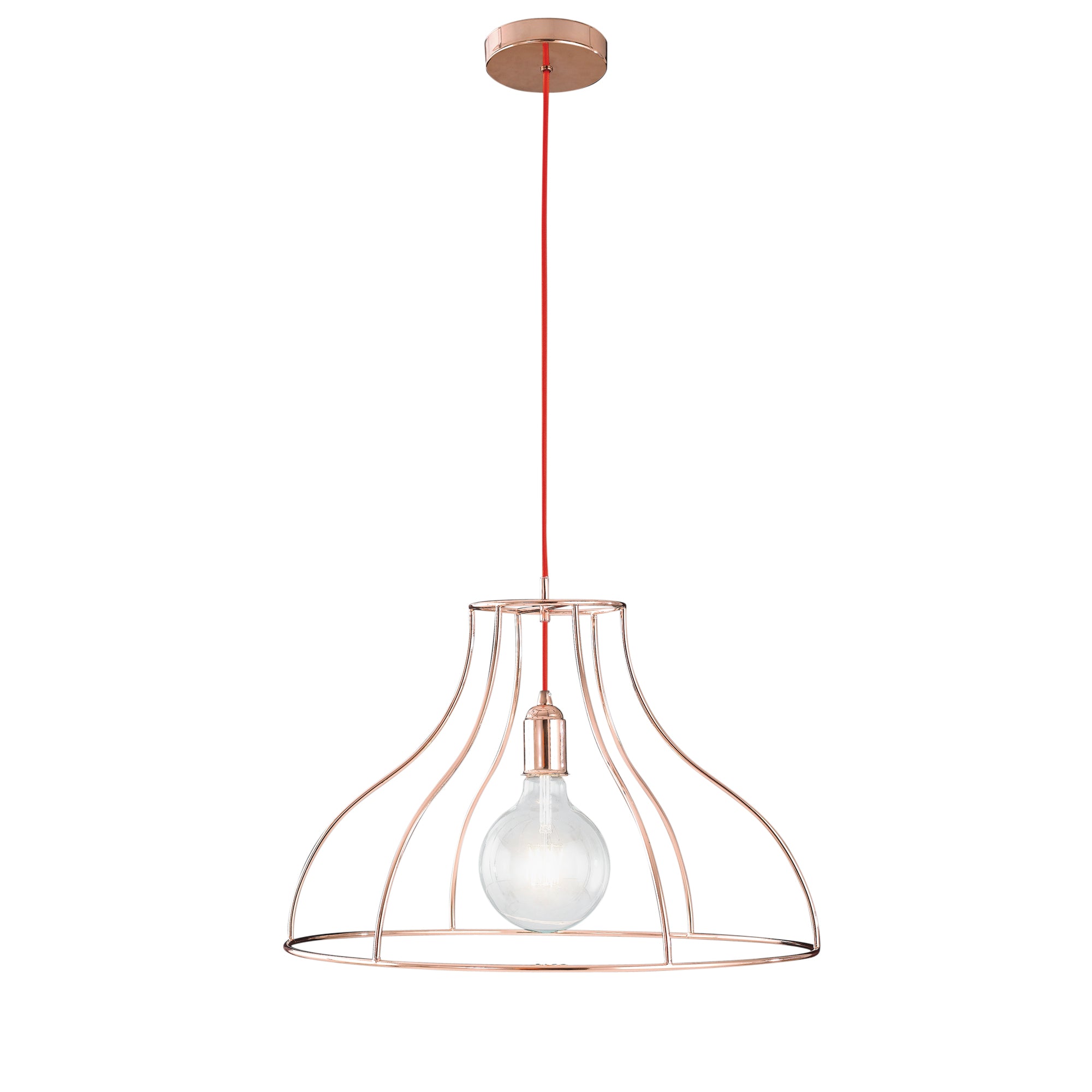 Objevte kouzlo jednoduchosti s unikátním závěsným svítidlem FRIDA. Jeho otevřená konstrukce z růžově zlatého kovu umožňuje, aby se žárovka stala ústředním designovým prvkem. Svítidlo je dále zdobeno červeným textilním kabelem, který přidává jemný kontrast a zvyšuje estetickou hodnotu tohoto moderního kousku.