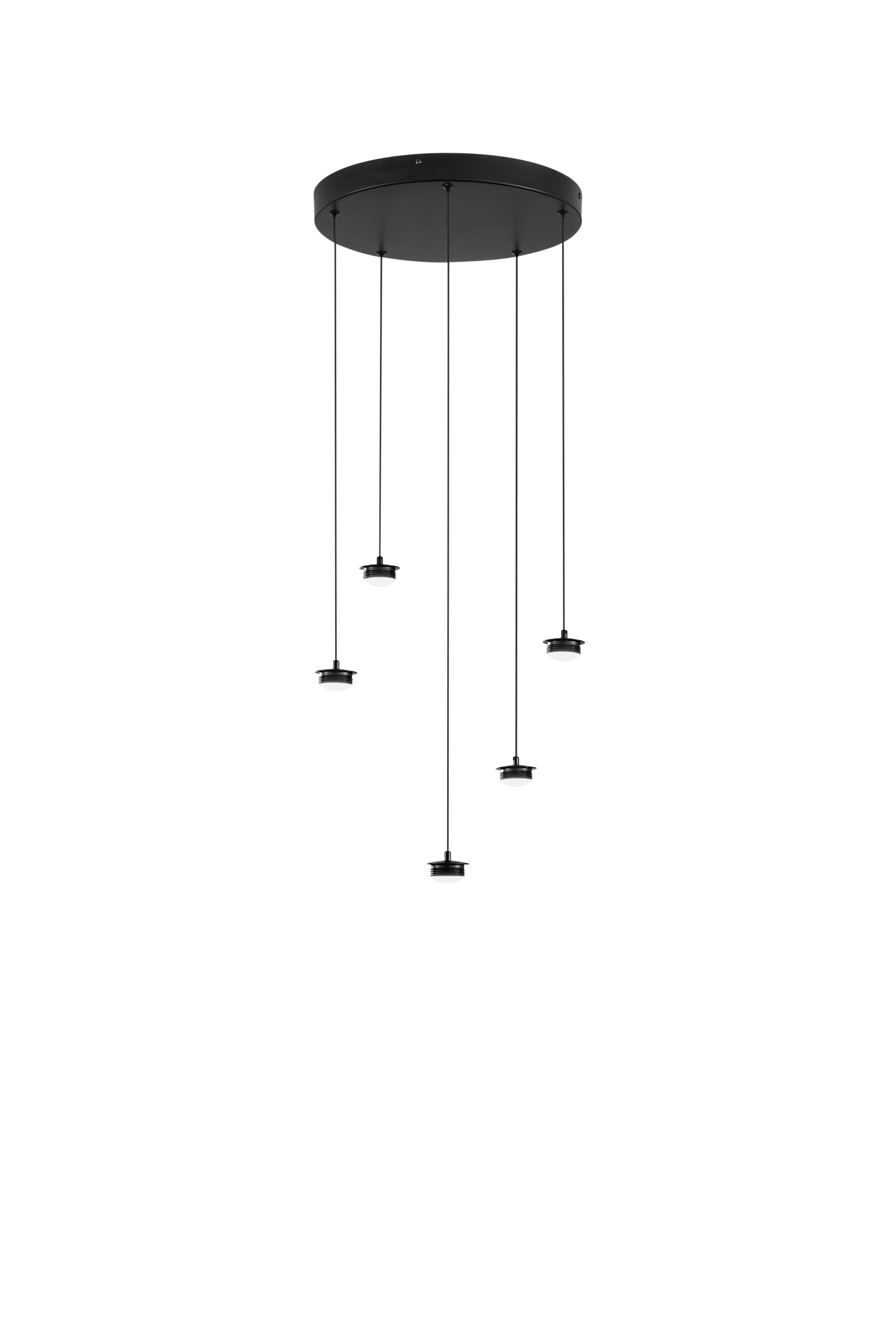 Závěsné svítidlo GISELLE od značky FAN Europe přináší designovou světelnou kompozici v elegantním černém provedení. Kulatá stropní základna o průměru 35 cm nese několik samostatně zavěšených světelných bodů, které vytvářejí vzdušný a dynamický efekt. Celek působí moderně, čistě a zároveň velmi stylově.