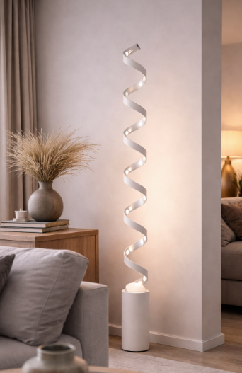 Stojací lampa HELIX od značky FAN Europe přináší ikonický spirálový tvar v elegantním bílostříbrném provedení, které působí moderně, čistě a nadčasově. Díky své výšce 152 cm se stává nepřehlédnutelnou dominantou prostoru – ideální do obývacího pokoje, pracovny nebo reprezentativního interiéru.