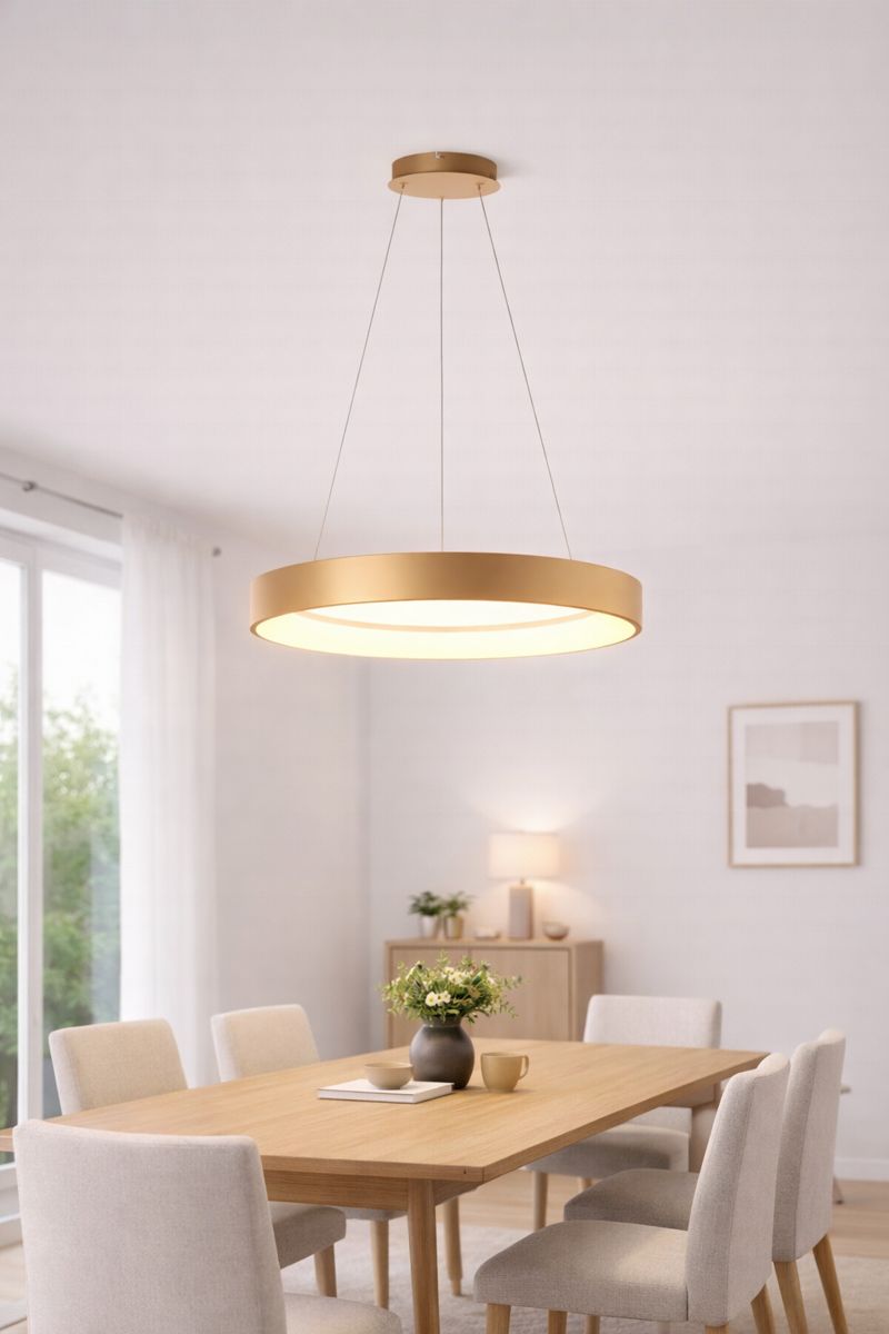 Moderní elegance v luxusním provedení: závěsné LED svítidlo FAN Europe NOAH ve zlatém odstínu zaujme minimalistickým kruhovým tvarem a vysokým světelným výkonem. Jemně kovový povrch dodává interiéru sofistikovaný nádech, zatímco rovnoměrné světlo vytváří příjemnou a funkční atmosféru. Svítidlo je navrženo jako dominantní, ale stále čistý prvek moderního prostoru.