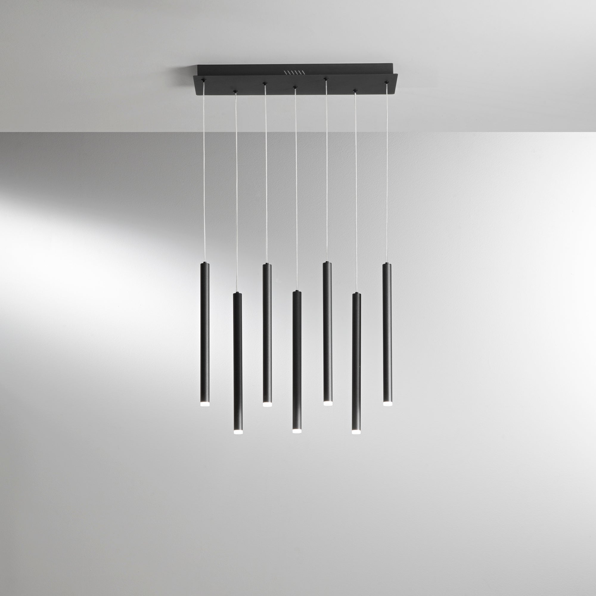 Čistá elegance v dramatickém podání. Závěsné LED svítidlo PYPE v sofistikované černé barvě od italské značky FAN Europe přináší do vašeho interiéru nádech luxusu a moderního minimalismu. Sedm jemných trubkových prvků zavěšených na obdélníkové kovové desce vytvářejí vizuálně poutavý design, který je zároveň vzdušný a nenápadně elegantní.