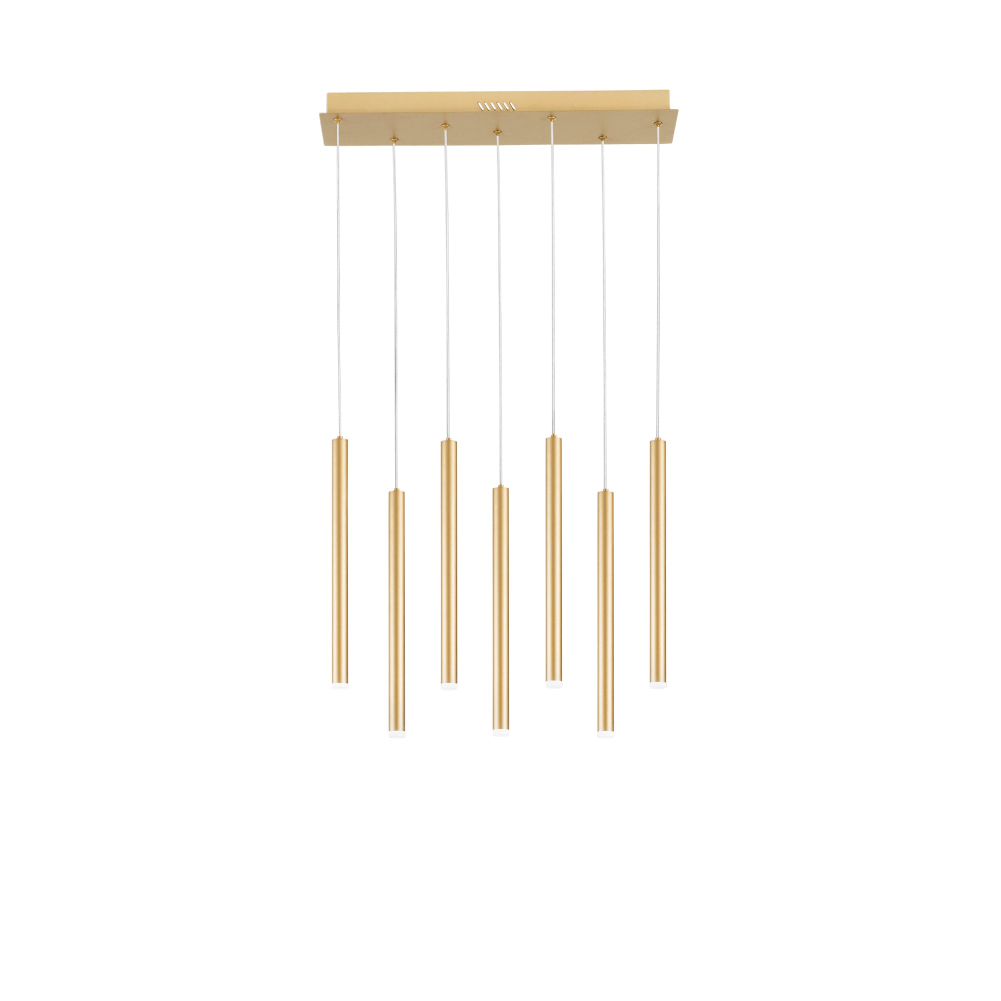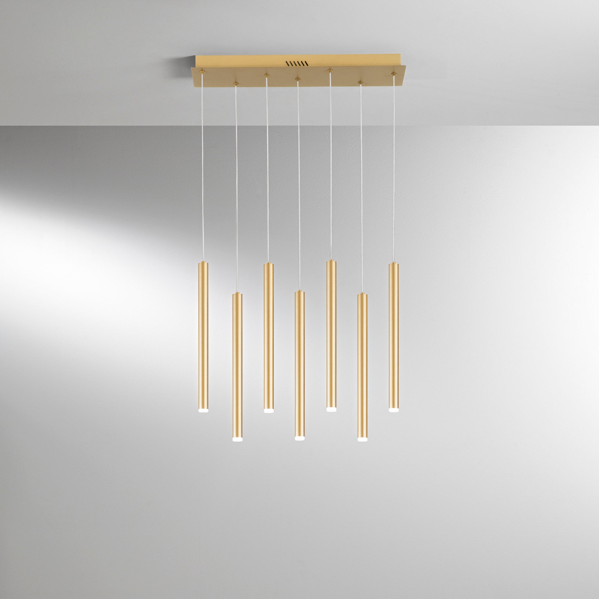Luxusní osvětlení, které zaujme na první pohled. Závěsné LED svítidlo PYPE v elegantní zlaté barvě přináší do vašeho interiéru šmrnc a sofistikovanost. Jeho trubková kovová konstrukce působí moderně a zároveň půvabně, což z něj činí ideální volbu pro reprezentativní prostory, jídelny, kanceláře nebo stylové restaurace. Závěsné zlaté svítidlo je složené z obdélnikové kovové desky a 7 velmi tenkých trubkových prvků.