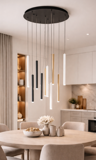 Svítidlo je určeno pro interiérové použití (IP20) a díky více samostatným závěsům vytváří zajímavý světelný efekt i při pohledu z různých úhlů.