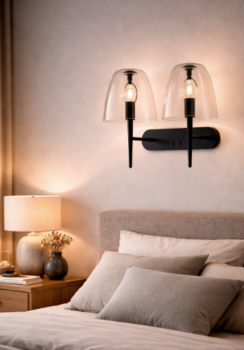 Černá kovová konstrukce vytváří výrazný kontrast ke sklu a dodává svítidlu lehce industriální charakter. Dva světelné body zajišťují rovnoměrné osvětlení, díky čemuž je svítidlo ideální do ložnice nad noční stolky, do chodby nebo jako stylové osvětlení nad komodu. Krytí IP20 jej předurčuje do suchých interiérů.