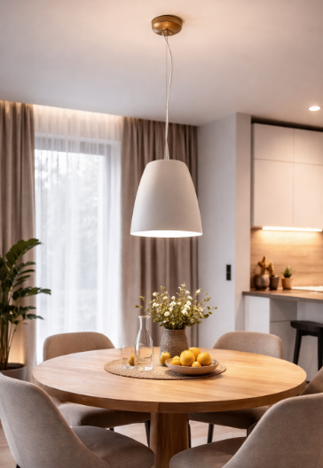 Díky své univerzálnosti se hodí nad jídelní stůl, kuchyňský ostrůvek i jako solitérní světlo do ložnice či obývacího prostoru. Patice E27 umožňuje zvolit světelný zdroj podle požadované atmosféry – od teplého útulného světla až po jasnější pracovní osvětlení. Krytí IP20 jej předurčuje do suchých interiérů.