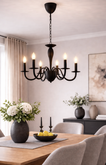 Závěsné svítidlo FAN Europe ARMSTRONG 6xE14 v matném černém provedení přináší výraznou, ale elegantní interpretaci tradičního víceramenného lustru. Šest ladně tvarovaných ramen vytváří harmonickou siluetu, která působí lehce, a přesto se stává dominantním prvkem místnosti.