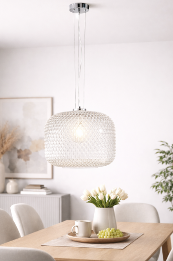 Závěsné svítidlo FAN Europe ASHFORD v čirém provedení je symbolem nadčasového designu a lehkosti. Průhledné skleněné stínidlo s dekorativní strukturou jemně rozptyluje světlo a vytváří příjemnou atmosféru bez zbytečné vizuální zátěže. Díky průměru Ø 40 cm se stává výrazným, ale stále elegantním prvkem interiéru. Skvěle se hodí nad jídelní stůl, do obývacího pokoje i do vzdušné ložnice.