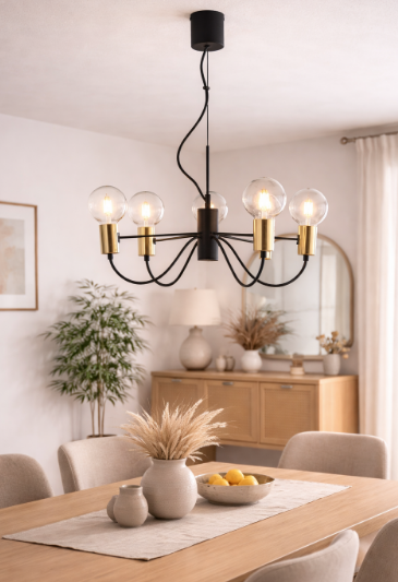 Pět světelných zdrojů E27 je rozmístěno na jemně zakřivených ramenech, což dodává svítidlu vzdušnost a zajímavý vizuální efekt. Svítidlo je ideální například nad jídelní stůl, do obývacího pokoje nebo do moderní kuchyně s jídelním koutem, kde vytvoří příjemné a rovnoměrné osvětlení.