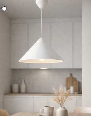 Bílé provedení opticky odlehčuje prostor a podporuje pocit vzdušnosti, díky čemuž je svítidlo ideální do moderních, minimalistických i skandinávských interiérů. Kuželové stínidlo zajišťuje rovnoměrné a příjemné osvětlení, které oceníte při stolování i každodenních činnostech.