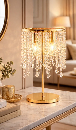 Luxus, který rozzáří váš interiér: stolní lampa FAN Europe BREEZE 2xE14 ve zlatém provedení s křišťálovými ověsy přináší do prostoru hřejivý lesk a elegantní atmosféru. Kombinace zlatého kovu a čirých krystalů vytváří působivý vizuální efekt, který vynikne jak ve dne, tak při rozsvícení.