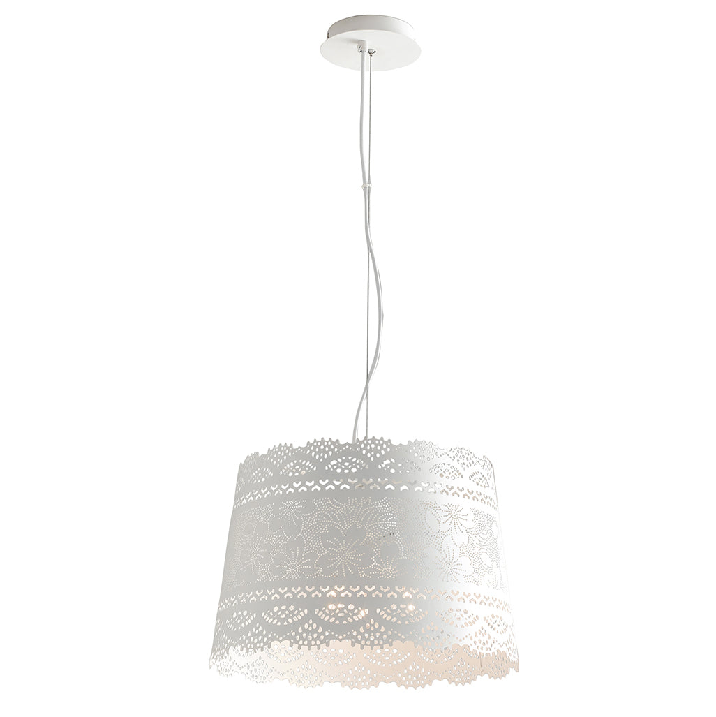 Svítidlo FAN Europe CLUNY je nejen zdrojem světla, ale také krásným dekoračním prvkem, který do vašeho prostoru přinese jemnost a eleganci. Jeho závěsný design s netradičním kovovým stínidlem, které imituje krajkový vzor, dává každému interiéru nádech sofistikovanosti a luxusu. Jemná bílá matná povrchová úprava kovu vytváří kontrast k detailům, které vypadají jako filigránské krajky, a dodává tak svítidlu unikátní charakter.