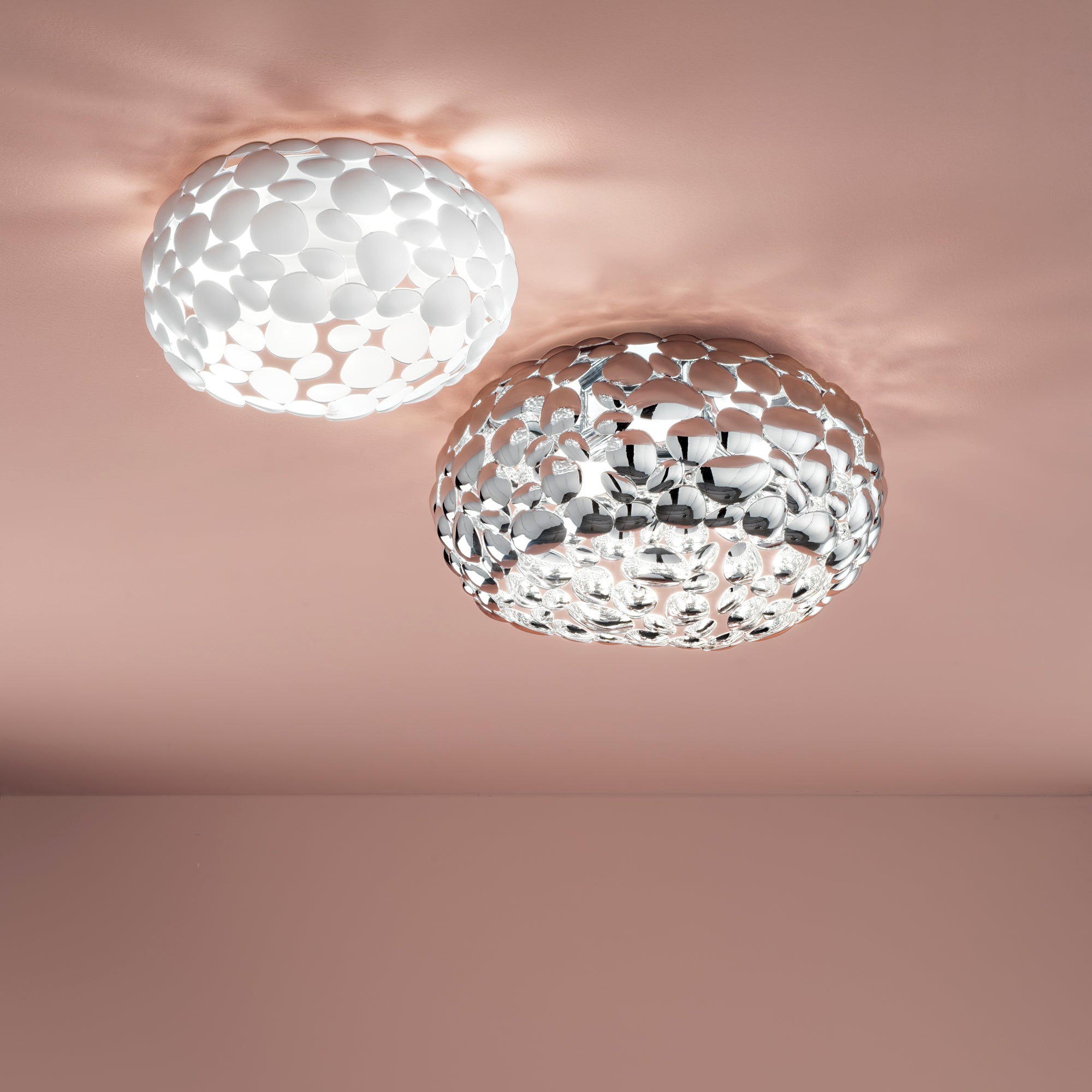 Originální design prezentuje nevšednost, jednoduchost, krásu a eleganci. Krásné stropní svítidlo přitahuje dvěma prvky: moderní podobou a silným světlem, které umožňuje dostatečné osvětlení, jak u jídelního stolu, tak v obývacím pokoji či ve vstupních halách. Vyplní velké interiéry teplým bílým světlem a vytvoří útulnou atmosféru. Lustr vytváří světelné efekty v celé místnosti, díky bílému kovu v podobě malých oblázků.