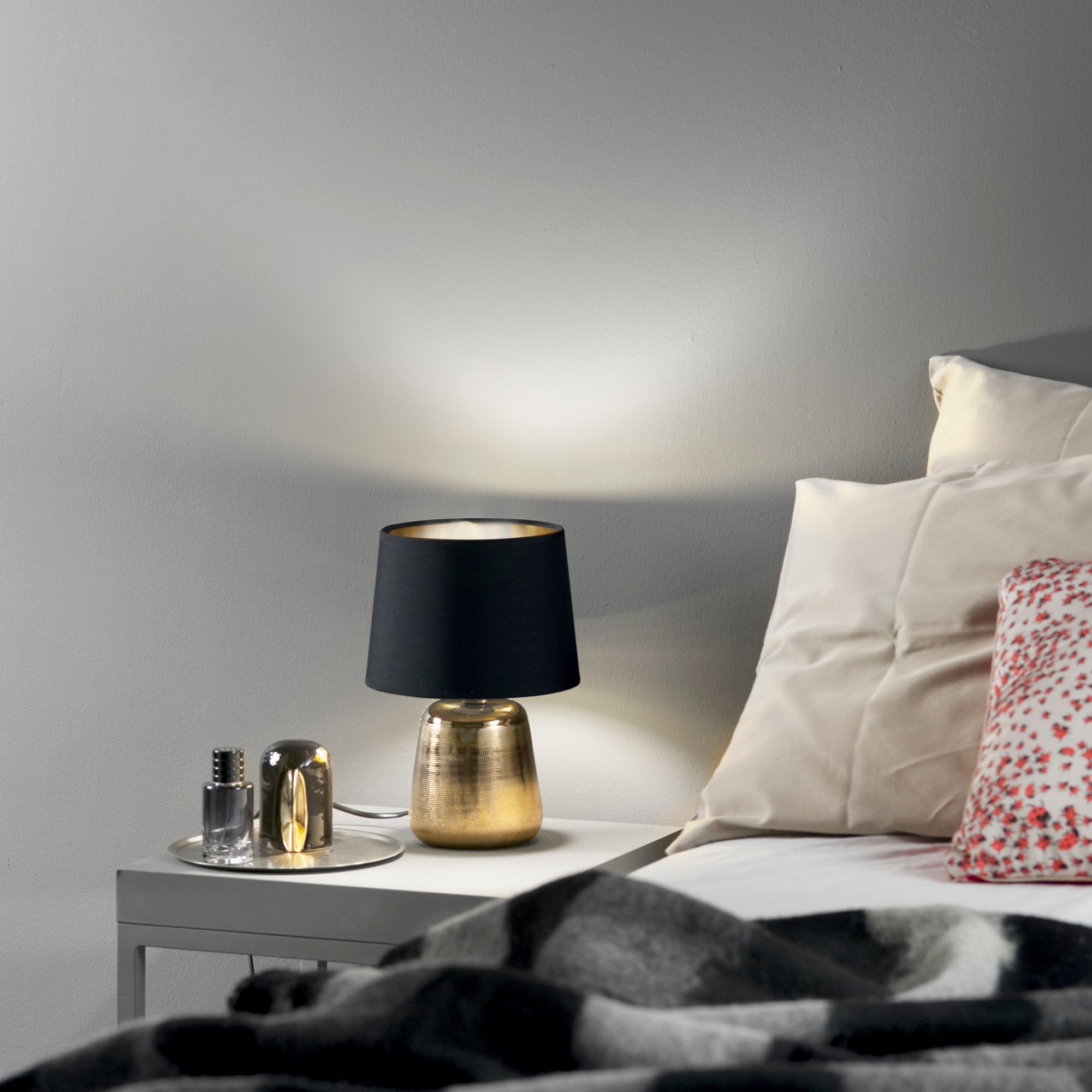Díky keramické základně s jemně vytlačovaným vzorem a zlaté barvě, která vnáší do interiéru nádech elegance, je tato lampa nejen funkční, ale i stylovým prvkem, který přitahuje pozornost a zároveň zůstává decentním doplňkem. S výškou 29 cm se skvěle hodí na noční stolek, pracovní stůl nebo jako dekorativní prvek v obýváku.