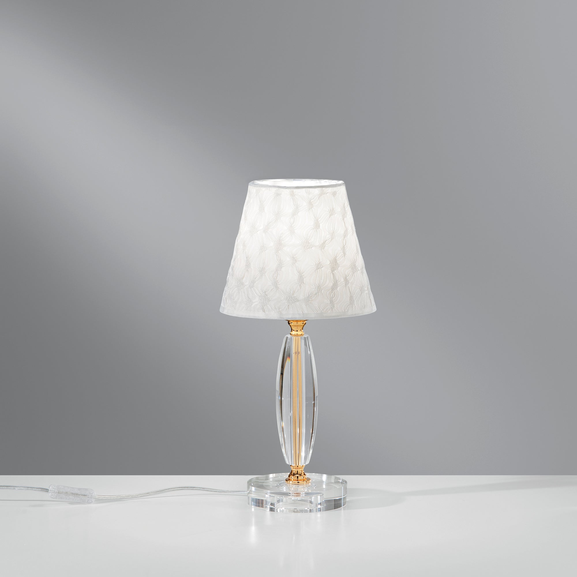 Dodejte svému prostoru nádech noblesy a teplého kouzla se stolní lampou FAN Europe EPOQUE. Tato lampa je harmonickým spojením rafinovaného zlatého kovu, ručně foukaného čirého skla a elegantního bílého textilního stínidla. Její jemný design a precizní detaily vytvářejí jedinečný prvek, který vnese do vašeho interiéru pocit luxusu a sofistikace.