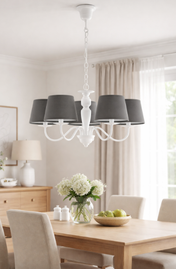 Závěsné svítidlo FAN Europe FAVOLA 5xE14 přináší elegantní spojení klasického tvaru a moderního kontrastu. Bílá konstrukce s jemně tvarovanými rameny je doplněna tmavými textilními stínidly, která dodávají svítidlu výrazný charakter. Díky pěti světelným bodům poskytuje dostatek světla pro běžné denní využití i příjemnou večerní atmosféru.