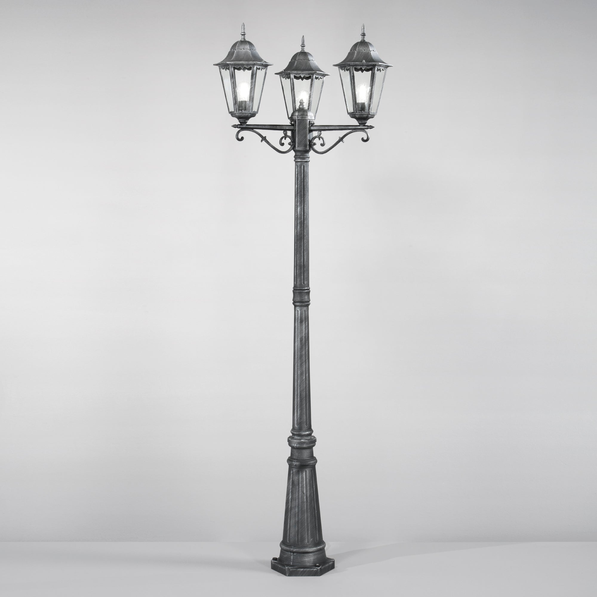 Stojací svítidlo FIRENZE v černé barvě se stříbrným kartáčováním představuje spojení elegance a funkčnosti pro vaše venkovní prostory. Tato lucerna z broušeného černého tlakově litého hliníku s třemi průhlednými skleněnými difuzory není jenom prostředkem k osvětlení, ale také designovým prvkem, který okouzlí vaše okolí.