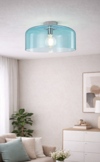 Transparentní tyrkysové sklo jemně tónuje světlo a vytváří příjemnou atmosféru. Díky stropní montáži je svítidlo praktickým řešením do bytů s nižší výškou stropu, kde není prostor pro závěsnou variantu.