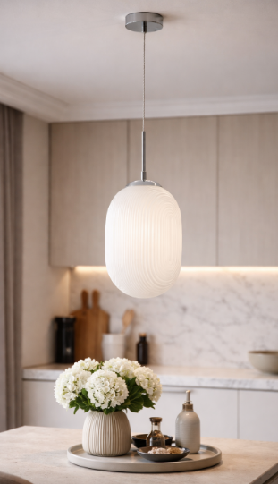 Závěsné svítidlo GREENWICH od značky FAN Europe v bílém provedení přináší čistý design a decentní eleganci do každého interiéru. Oválné skleněné stínidlo s jemnou plastickou strukturou vytváří zajímavý vizuální efekt a zároveň příjemně rozptyluje světlo. Chromové detaily dodávají svítidlu moderní nádech a podtrhují jeho nadčasový charakter.
