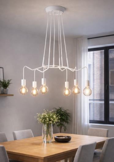 Bílé kovové provedení dodává svítidlu čistý a nadčasový vzhled. Otevřený design bez stínidel umožňuje vyniknout samotným žárovkám, díky čemuž se svítidlo stává výrazným dekorativním prvkem interiéru. Skvěle se hodí zejména pro dekorativní filamentové žárovky, které zvýrazní jeho styl a vytvoří příjemnou atmosféru.