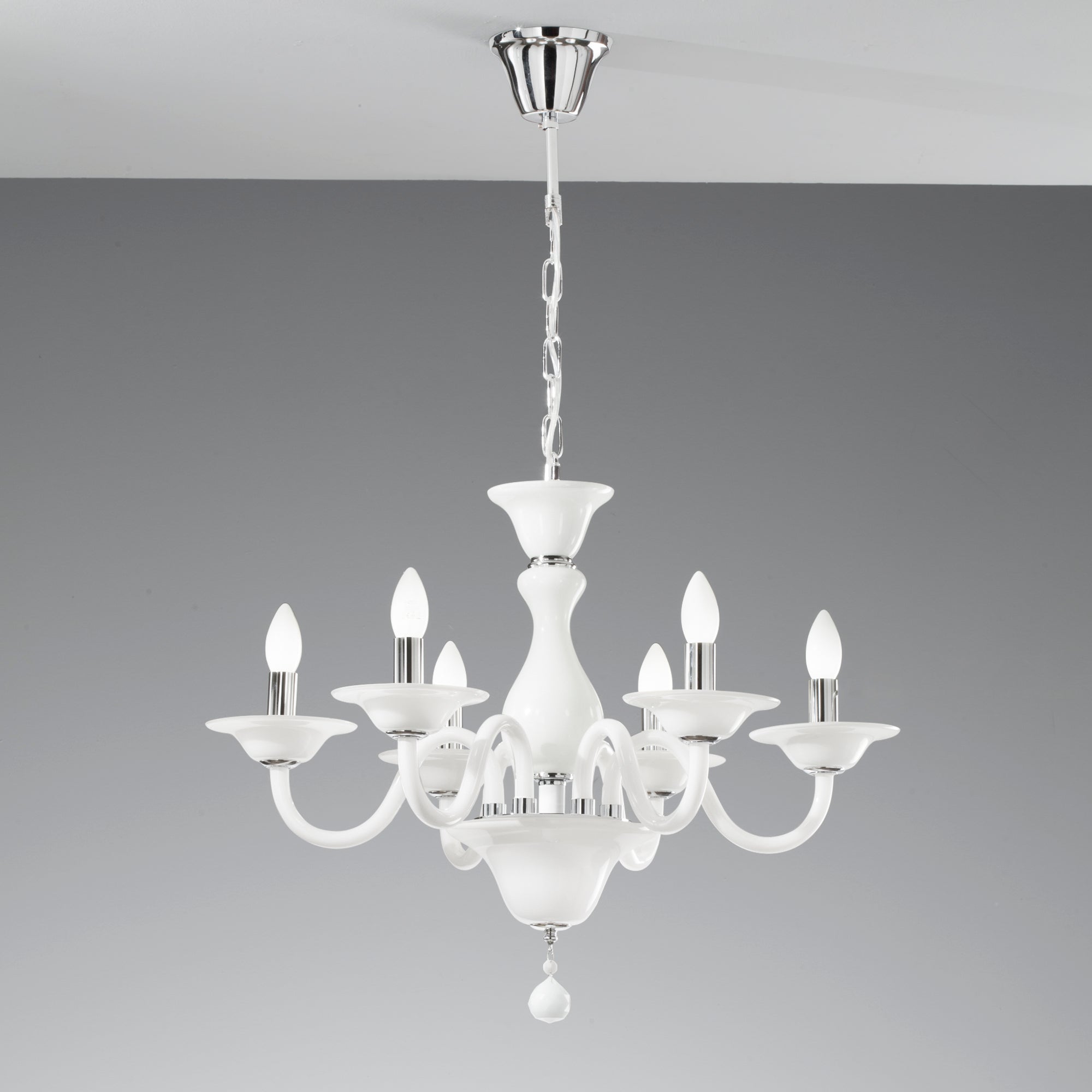 Vytvořte interiér plný jemnosti a vytříbeného vkusu se závěsným svítidlem FAN Europe SOFFIO. Jeho nadčasový design z bílého foukaného skla přináší do prostoru lehkost a harmonii. Šest světelných bodů, zvýrazněných lesklými chromovými detaily, dodává místnosti hřejivé osvětlení a zároveň okouzlující atmosféru, která zaujme na první pohled.