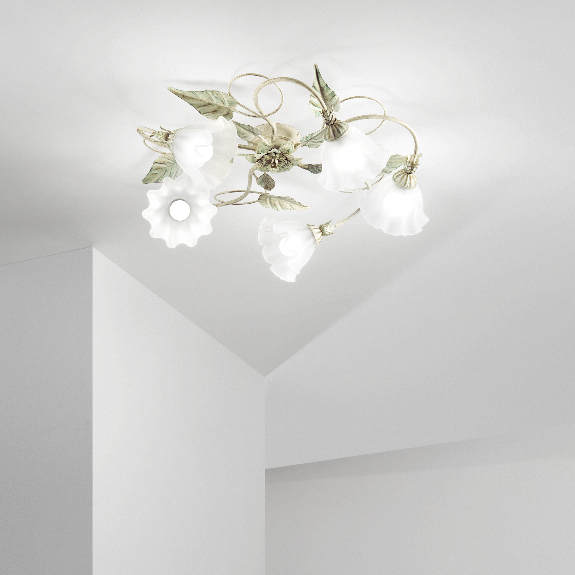 Zahalte svůj interiér do kouzla elegance a jemnosti se stropním svítidlem ISOTTA od prestižní italské značky FAN EUROPE. Toto jedinečné osvětlení se pyšní ručně zdobenými dekoracemi listů, které přinášejí do prostoru přírodní nádech, a pěti skleněnými difuzory ve tvaru květin, jež vytvářejí hřejivou a uklidňující atmosféru.