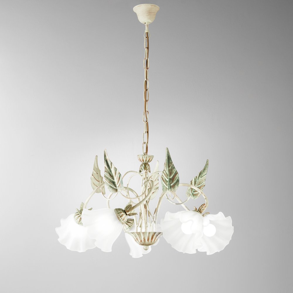 Zahalte svůj interiér do kouzla elegance a jemnosti se závěsným svítidlem ISOTTA od prestižní italské značky FAN EUROPE. Toto jedinečné osvětlení se pyšní ručně zdobenými dekoracemi listů, které přinášejí do prostoru přírodní nádech, a pěti skleněnými difuzory ve tvaru květin, jež vytvářejí hřejivou a uklidňující atmosféru.