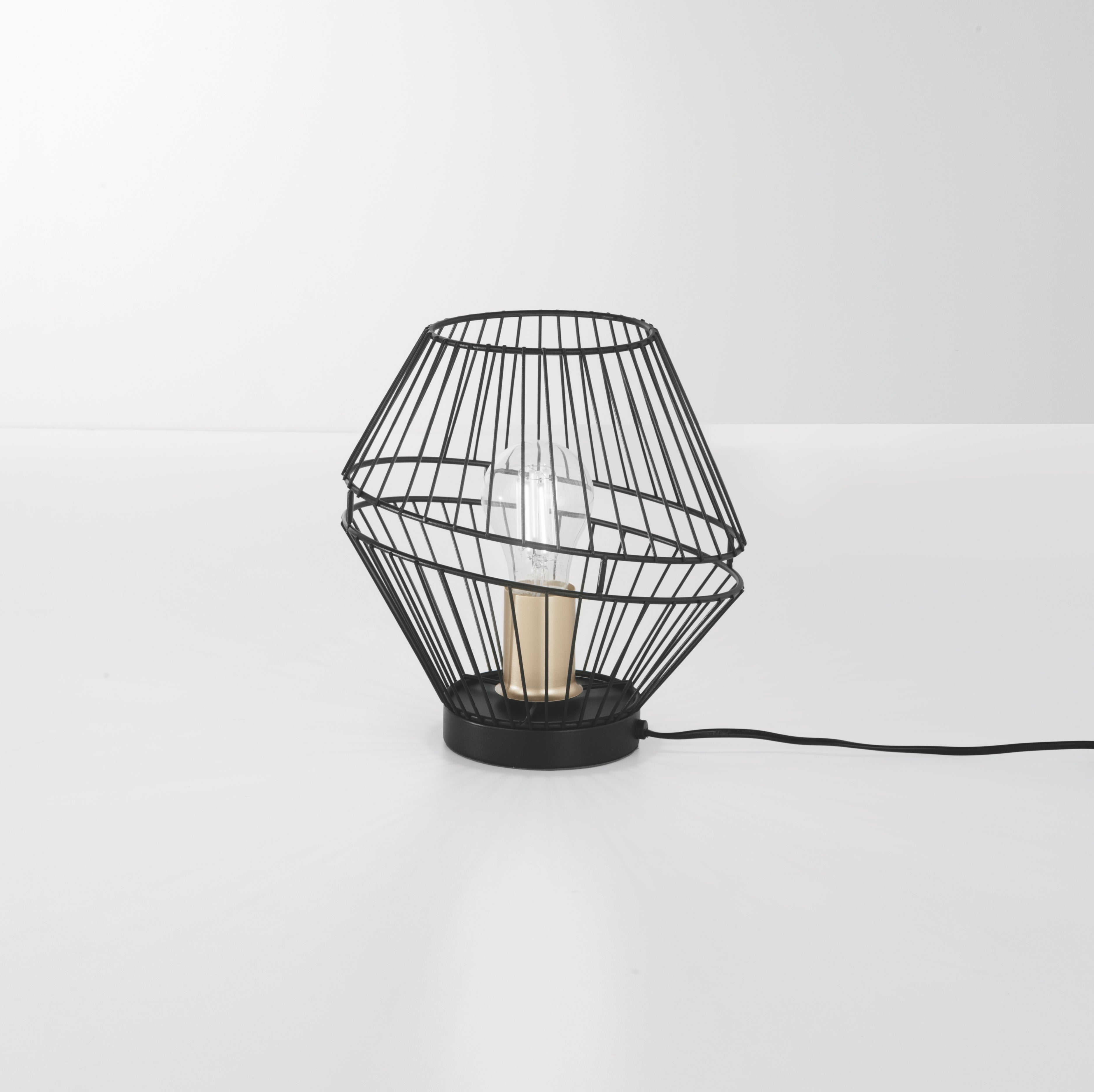 Stolní lampa KIKO od FAN EUROPE je odvážným a stylovým doplňkem každého interiéru. Jeho unikátní design ve tvaru klece kombinuje černý kov s jemnými liniemi a saténově zlatým povrchem, což vytváří harmonii elegance a moderního průmyslového stylu.