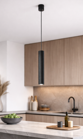 Závěsné svítidlo FAN Europe LORD v elegantní černé barvě zaujme svým výrazným rýhovaným povrchem a čistou válcovou siluetou. Minimalistický tvar v kombinaci s tmavým provedením vytváří sofistikovaný designový prvek, který se stane dominantou moderního prostoru.