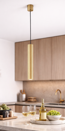 Štíhlé válcové tělo zavěšené na subtilním kabelu krásně vynikne nad kuchyňským ostrůvkem, barovým pultem i v reprezentativních komerčních prostorách. Díky patici GU10 si můžete vybrat světelný zdroj přesně podle požadované atmosféry – od teplého útulného světla až po jasnější pracovní osvětlení.