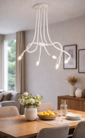 Bílé provedení dodává svítidlu čistý a nadčasový vzhled, díky kterému se snadno kombinuje s různými styly interiéru – od moderního přes skandinávský až po minimalistický styl. Díky více světelným zdrojům dokáže svítidlo rovnoměrně osvětlit prostor a zároveň působí jako výrazná designová dekorace.