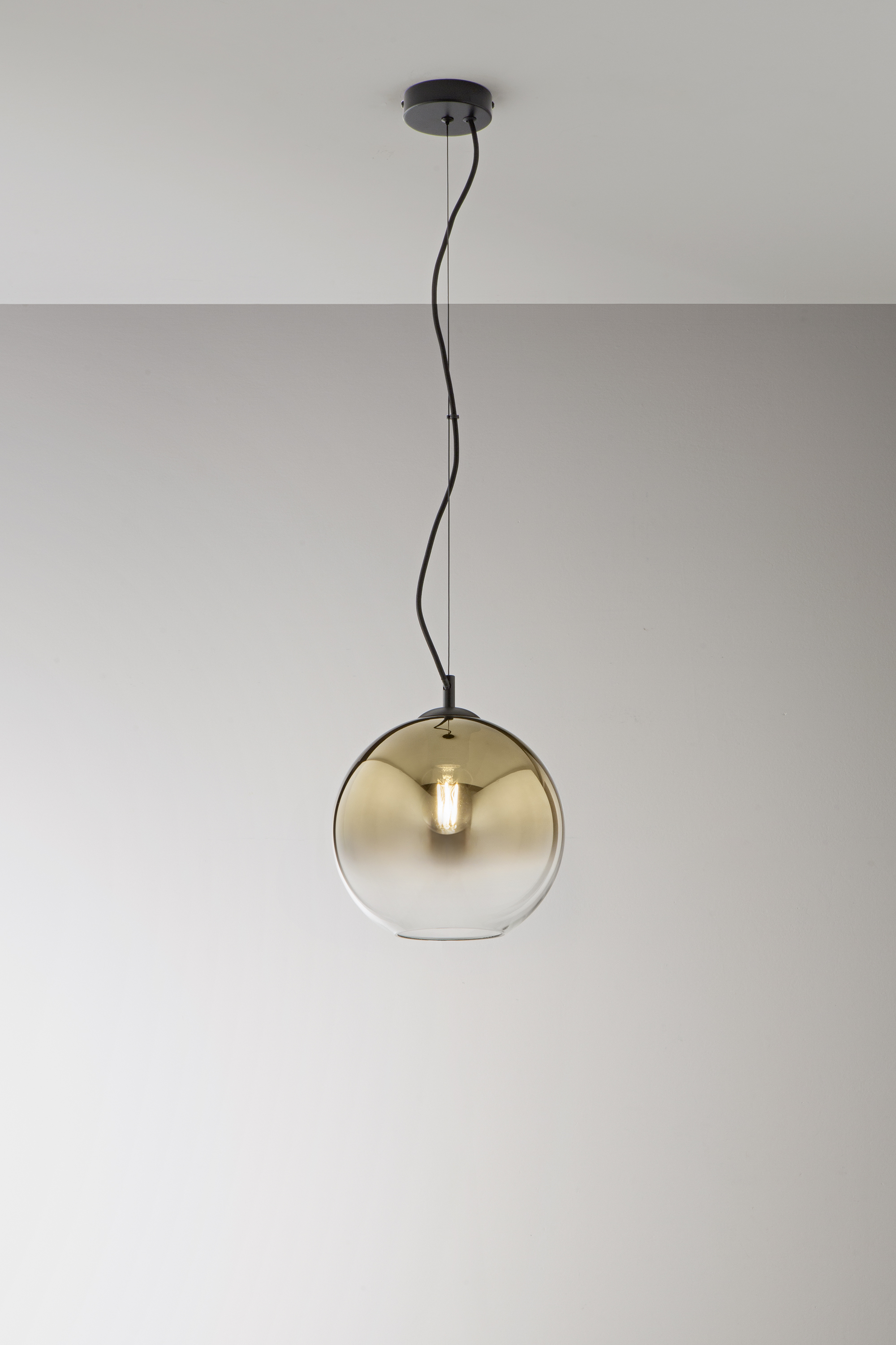 Závěsné svítidlo MARTE od značky FAN Europe zaujme svým sofistikovaným zlatavým tónem a jemným metalickým efektem, který vytváří působivou hru světla a odlesků. Kulovitý tvar působí elegantně a harmonicky, zatímco černá stropní základna a kabel podtrhují moderní charakter svítidla.