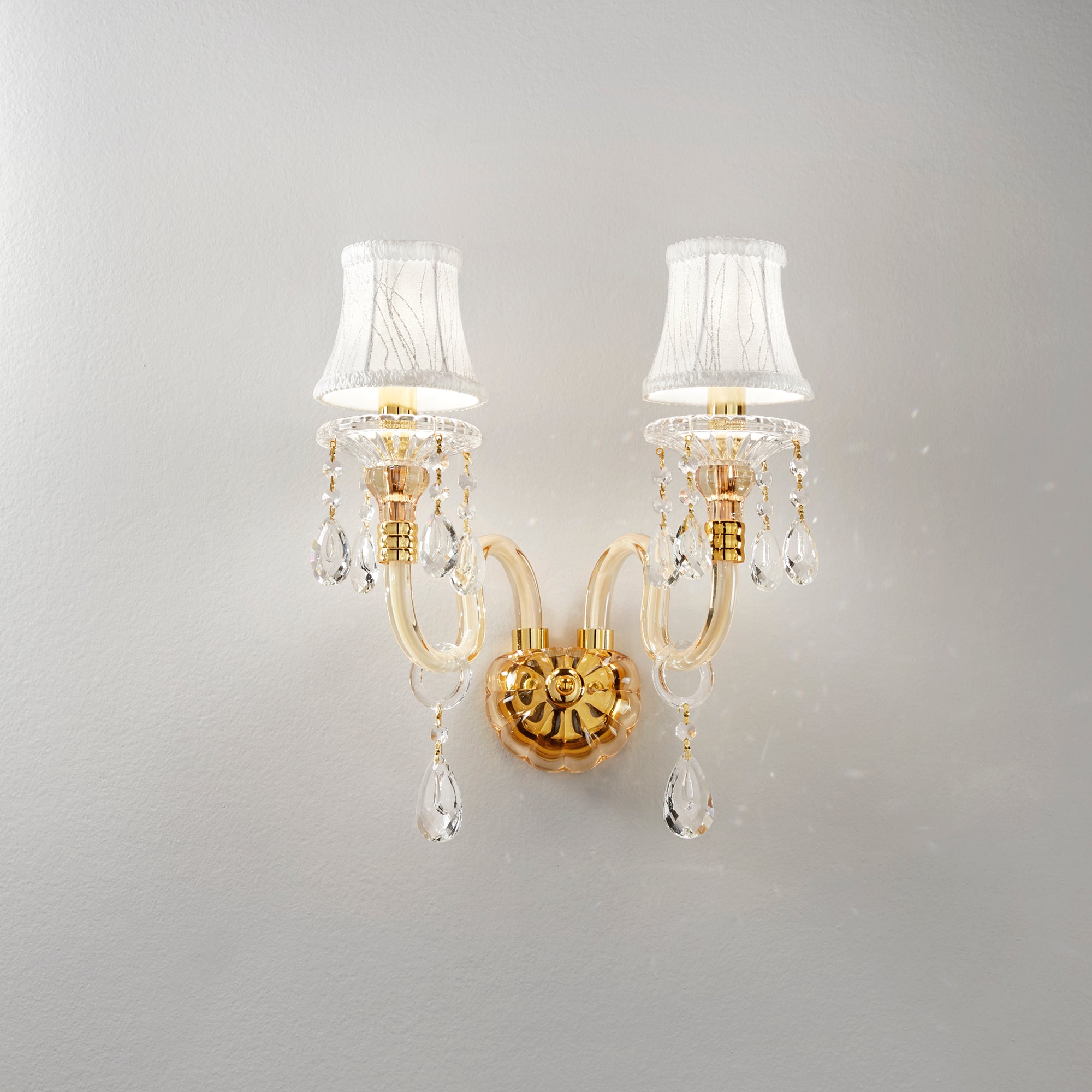 Luxusní lustr se dvěma rameny v barokním stylu Faneurope Monet do moderních i rustikálních interiérů. Milovníky designu nikdy neomrzí tato kombinace zlatého lesklého kovu, broušeného skla K9 a látkového stínidla. Nástěnné svítidlo je vhodné do ložnic, obývacích a hotelových pokojů, restaurací i hotelů.