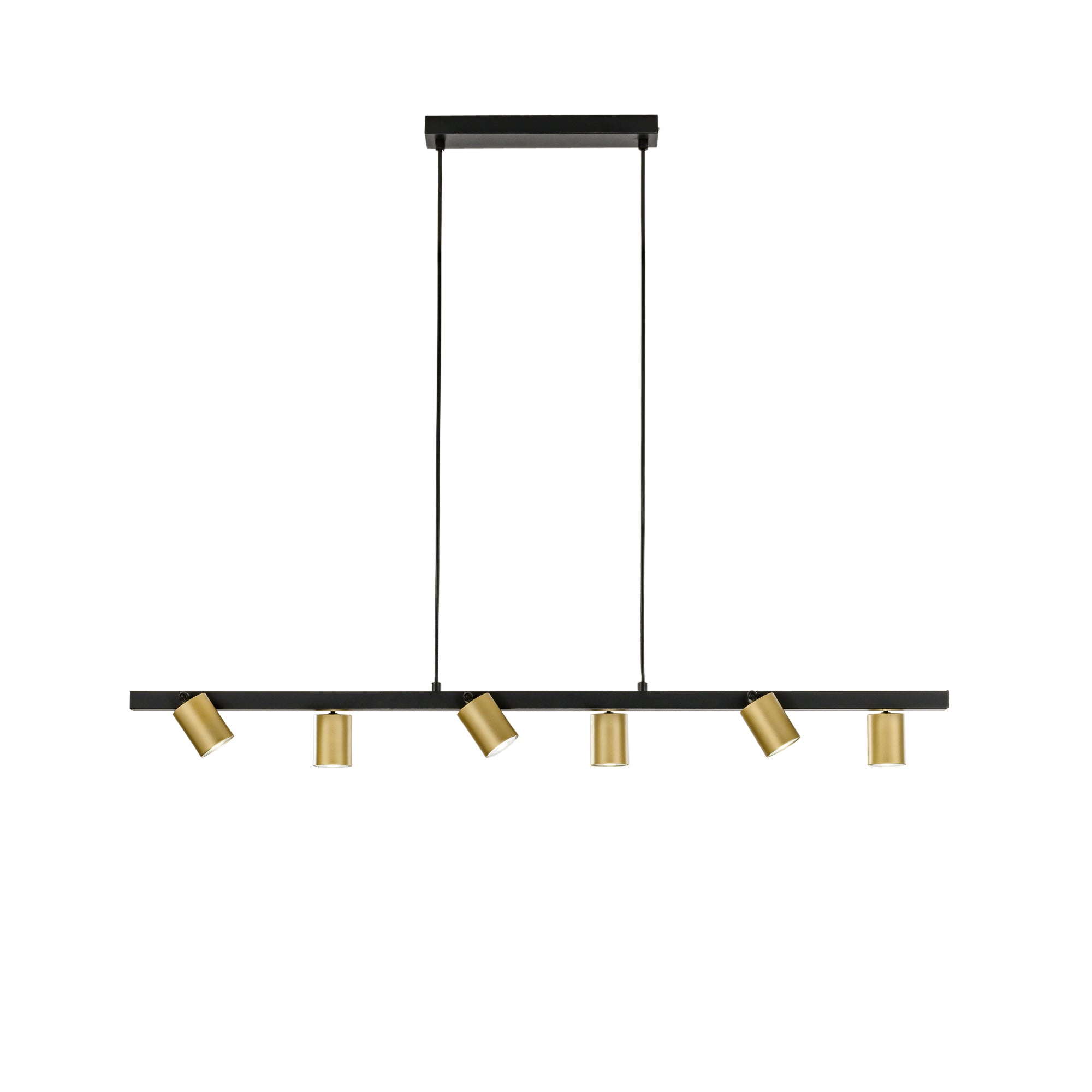 Závěsné svítidlo NIZZA přináší moderní minimalistický design, který v sobě spojuje čisté linie a funkčnost. Matně černá vodorovná lišta působí nadčasově a luxusně ji doplňuje šest nastavitelných kovových válců v saténovém zlatě. Díky výškově nastavitelným kabelům si snadno přizpůsobíte osvětlení přesně podle svých potřeb a stylu.