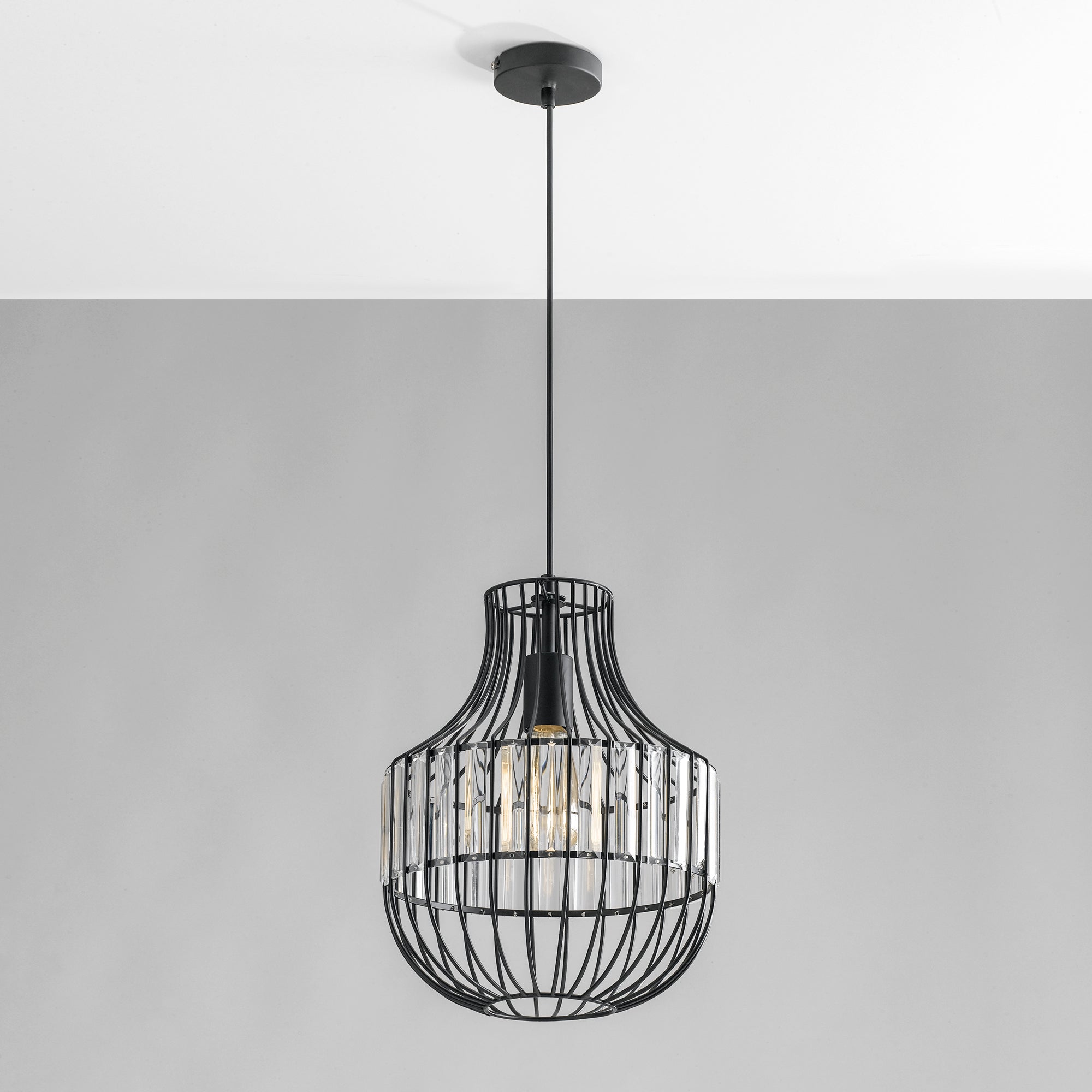 Závěsné svítidlo Faneurope OPIUM s jednoduchým drátěným designem a plátky z broušeného skla. Přes černou kovovou konstrukci bez stínidla je viditelná žárovka. Výšku lze upravit zkrácením kabelu. Tento produkt zdůrazní charakter interiéru a poskytne příjemné a netradiční osvětlení místnosti. Žárovka s paticí E27 není součástí produktu.