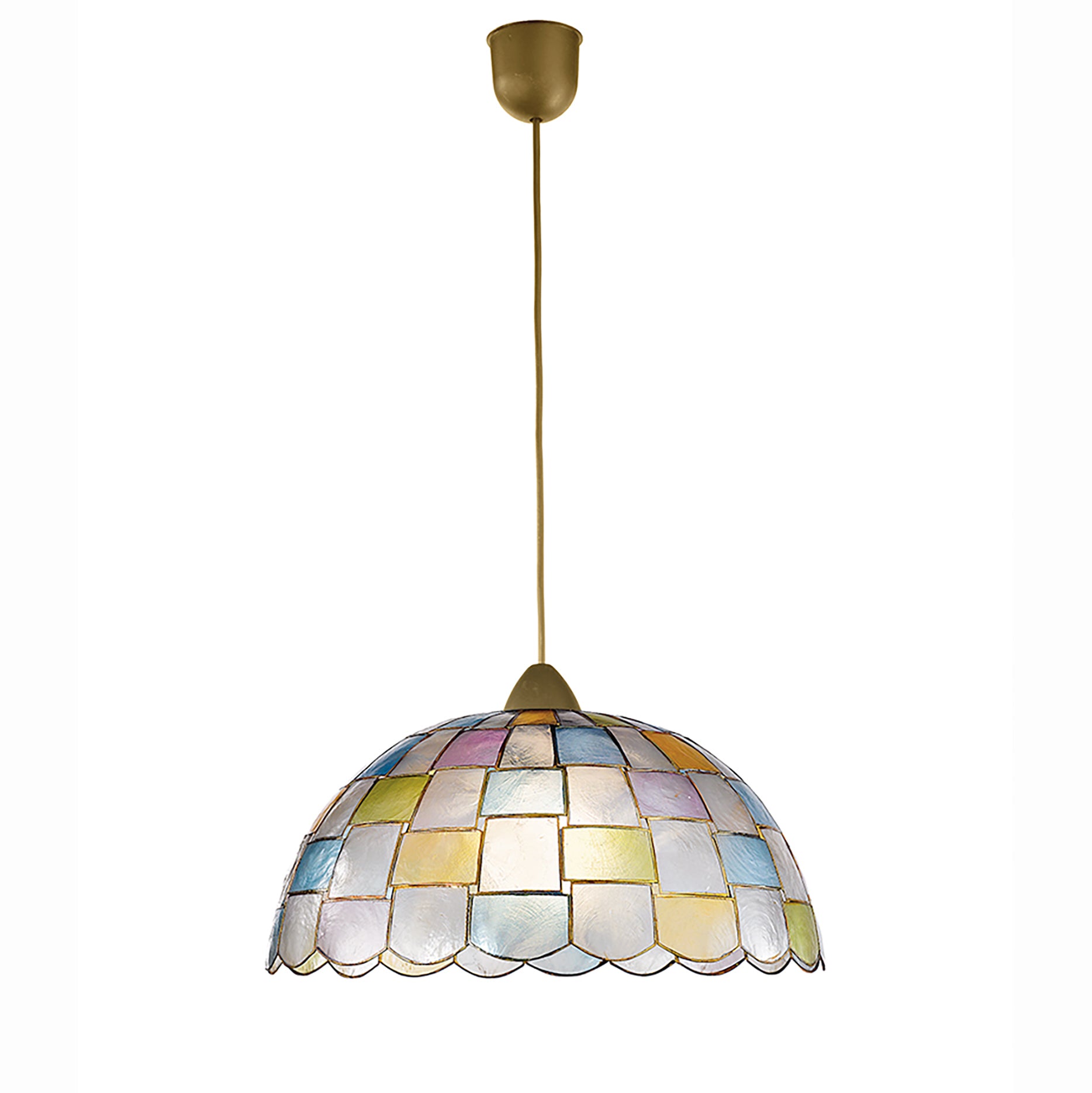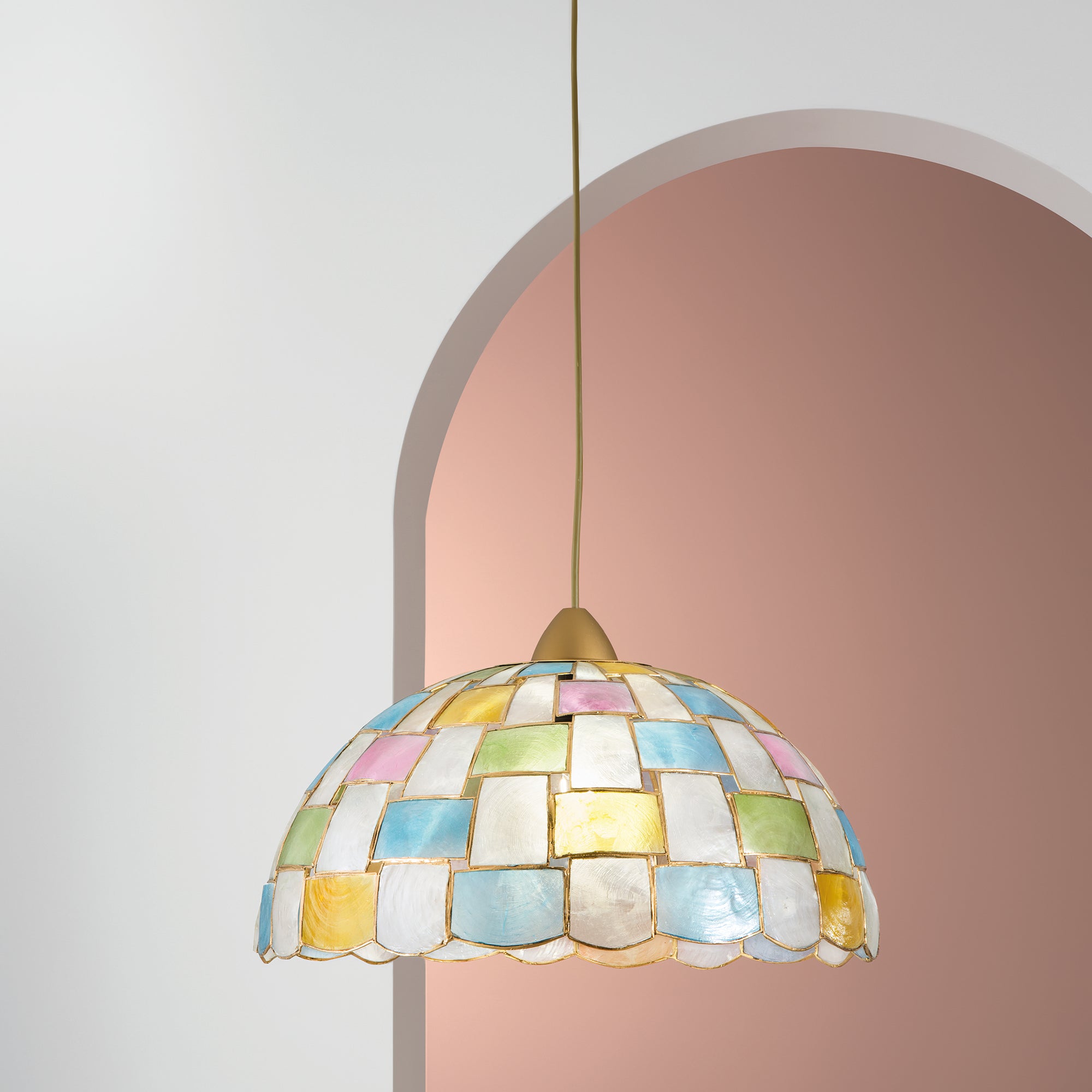 Svítidlo PAULA od FAN Europe přináší do vašeho prostoru kousek elegance a hravosti, který okouzlí na první pohled. Jeho barevný perleťový difuzor se skleněnou kostkovanou dekorací ve spojení se zlatým kabelem vytváří atmosféru plnou tepla a půvabu. Toto závěsné svítidlo je ideálním doplňkem pro moderní, ale i klasické interiéry, kde bude nejen funkčním zdrojem světla, ale také výrazným designovým prvkem.