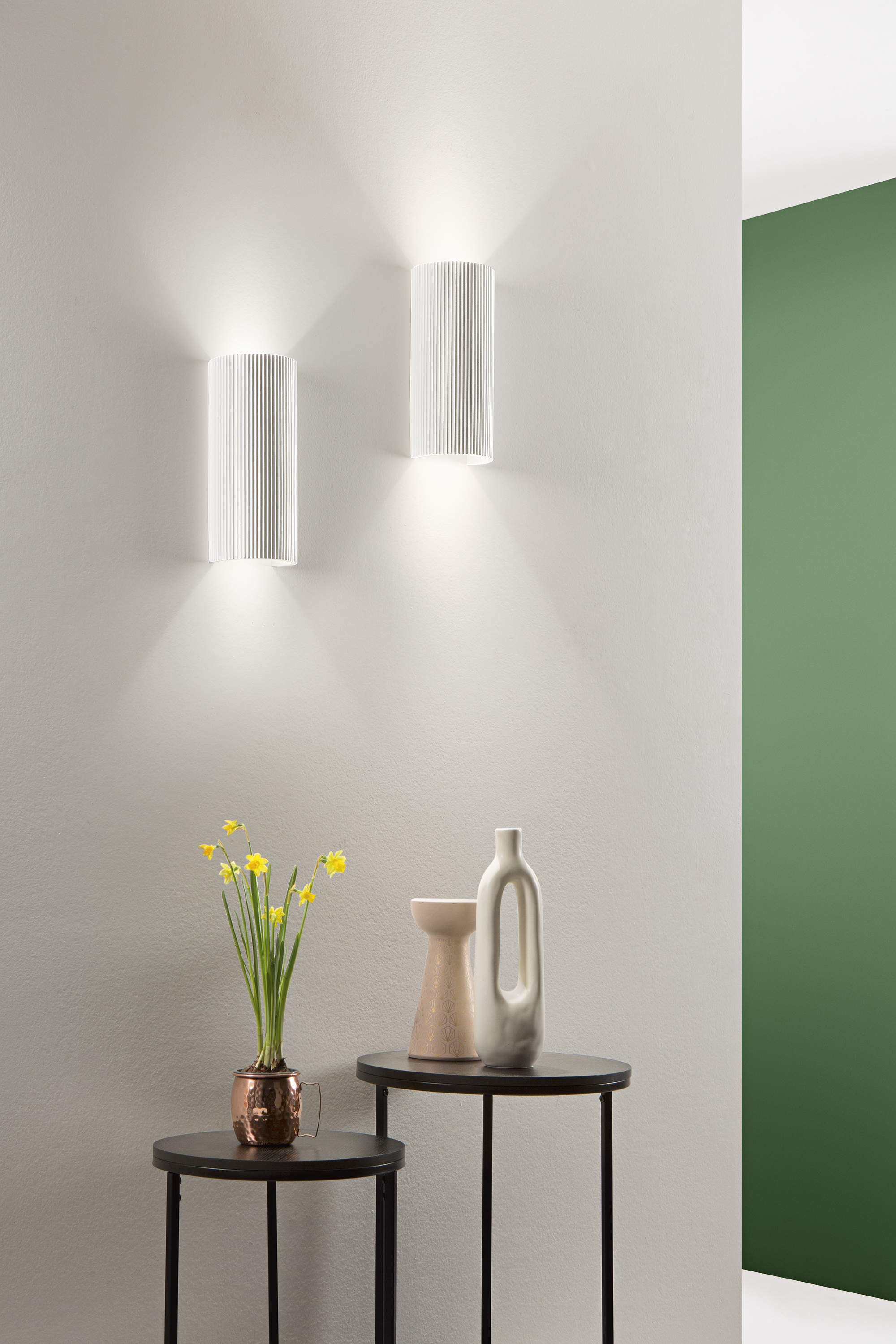 Bílé sádrové tělo umožňuje přetření dle barvy stěny, takže svítidlo dokonale zapadne do jakéhokoliv interiéru. Světlo je směrováno nahoru i dolů, čímž vytváří příjemnou atmosféru a zajímavý světelný efekt.