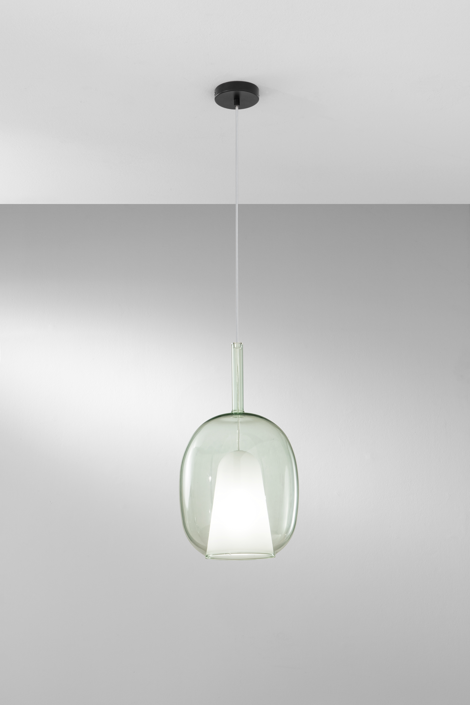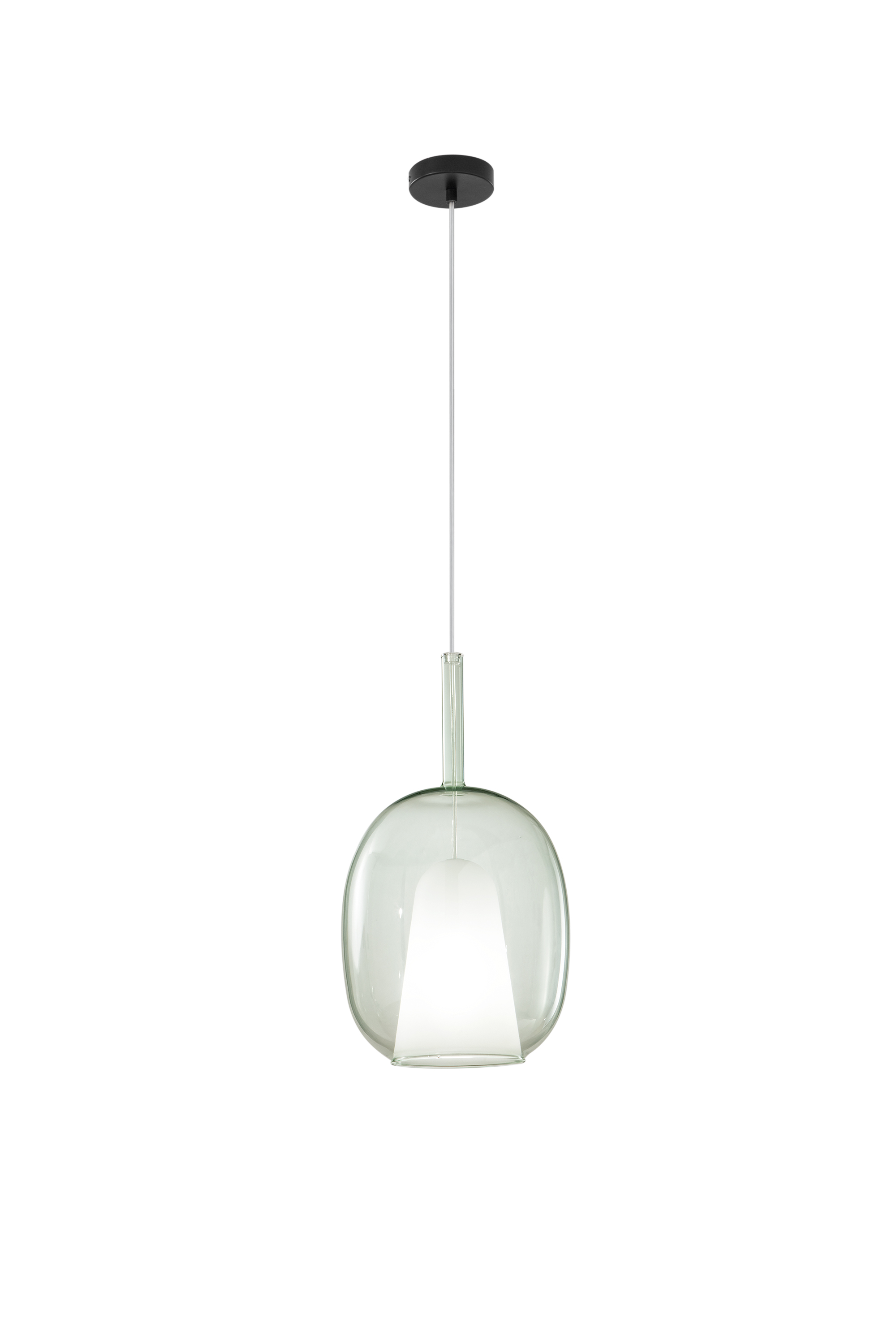 Transparentní zelenkavé sklo decentně filtruje světlo a vytváří příjemnou, klidnou atmosféru bez oslňování. Díky patici E27 si můžete zvolit světelný zdroj podle požadovaného výkonu i stylu – od dekorativní filamentové žárovky po úspornou LED variantu. Svítidlo je dodáváno bez montury, což umožňuje jeho kombinaci s různými stropními základnami PIREX a vytváření individuálních světelných sestav.