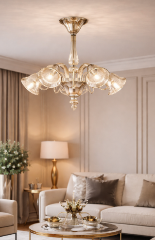 Závěsné svítidlo FAN Europe POSEIDON je dokonalým spojením jemného sklářského designu a nadčasové elegance. Jeho šampaňské sklo působí luxusně, ale zároveň vzdušně, takže krásně doplní jak klasický, tak moderně laděný interiér. Pět ladně tvarovaných ramen s dekorativními stínidly vytváří harmonický celek, který se stane přirozeným středem každé místnosti.
