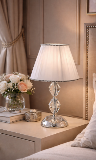 Stolní lampa RIFLESSO v chromovém provedení zaujme svým minimalisticky elegantním designem, který kombinuje čiré sklo s lesklými kovovými prvky. Díky subtilnější konstrukci a menším rozměrům působí nenápadně, ale přesto dodá interiéru nádech luxusu. Textilní stínidlo zajišťuje měkké rozptýlení světla, ideální pro vytvoření útulné atmosféry.