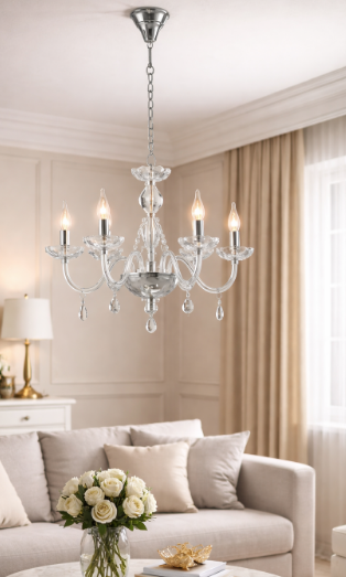 Závěsné svítidlo FAN Europe RIFLESSO v provedení s pěti rameny přináší do interiéru jemnou eleganci a vzdušnost. Precizně tvarované skleněné prvky v kombinaci s decentními křišťálovými ověsy vytváří krásnou hru světla, která prostor zútulní a dodá mu sofistikovaný nádech. Díky svým proporcím je ideální volbou tam, kde chcete elegantní svítidlo, ale bez přehnané dominance.